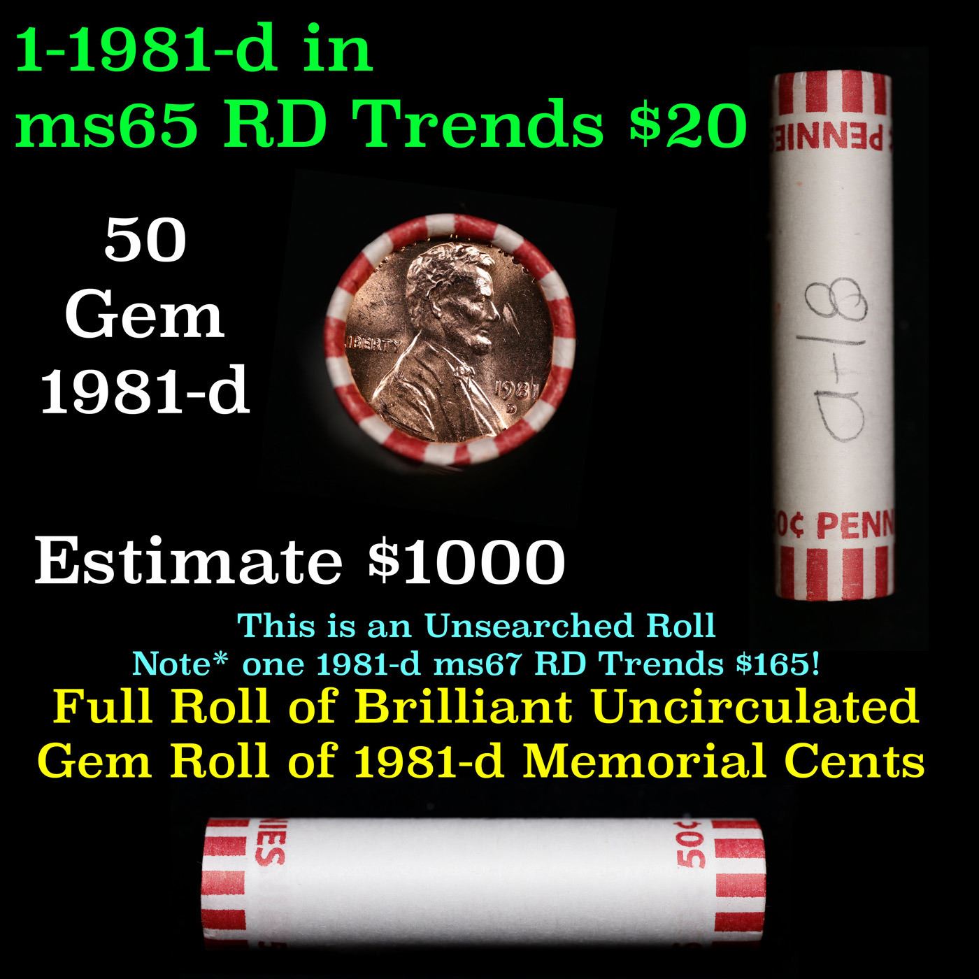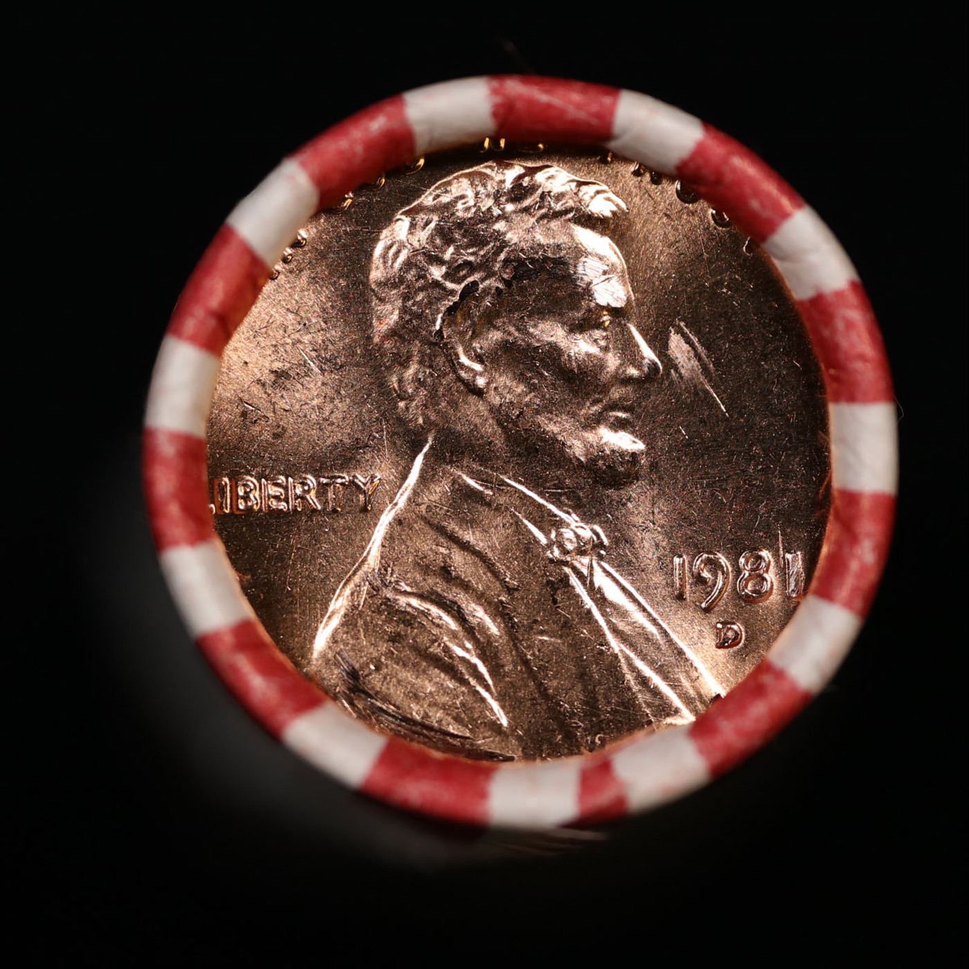 Shotgun Lincoln 1c roll, 1981-d 50 pcs Bank Wrapper.. A terrific Shotgun roll of Lincoln cents. Most if not all coin should be cherry red.