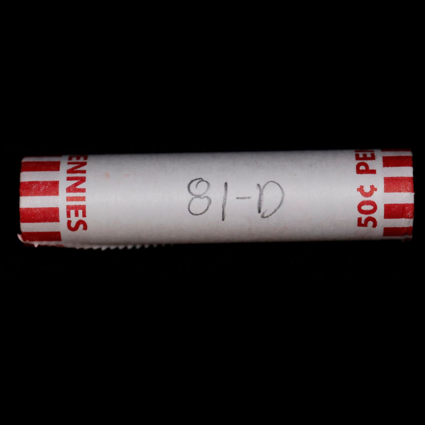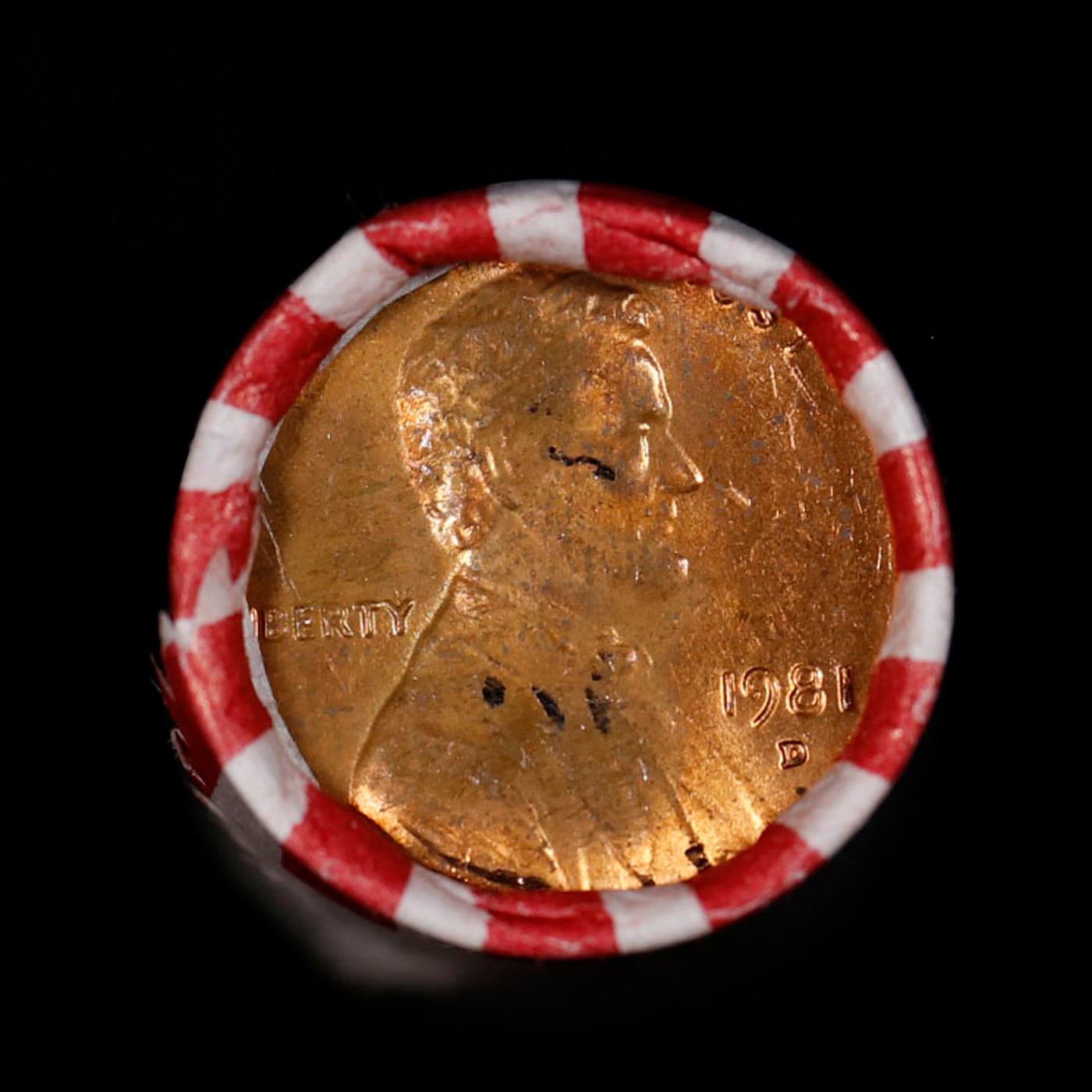 Shotgun Lincoln 1c roll, 1981-d 50 pcs Bank Wrapper.. A terrific Shotgun roll of Lincoln cents. Most if not all coin should be cherry red.