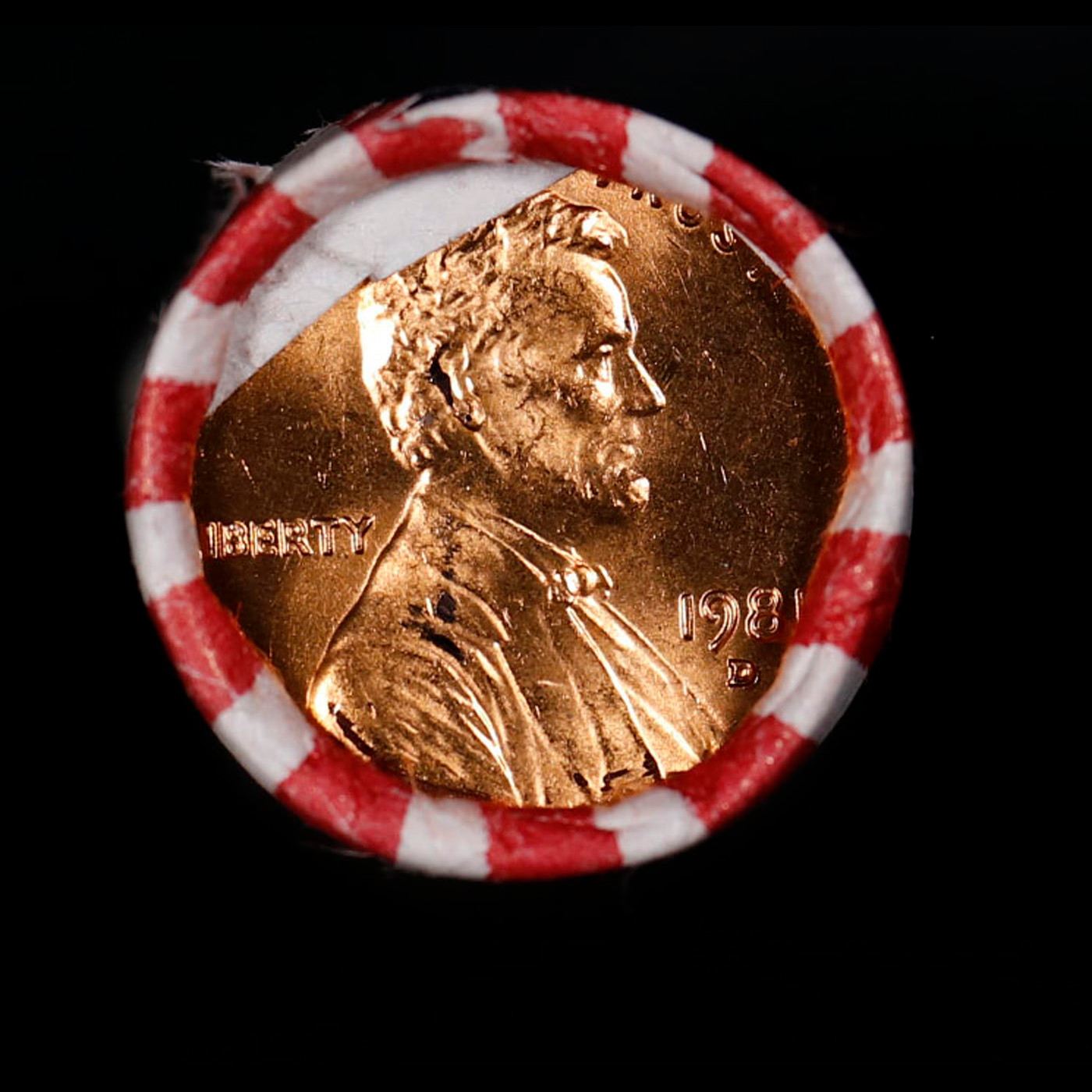Shotgun Lincoln 1c roll, 1981-d 50 pcs Bank Wrapper.. A terrific Shotgun roll of Lincoln cents. Most if not all coin should be cherry red.