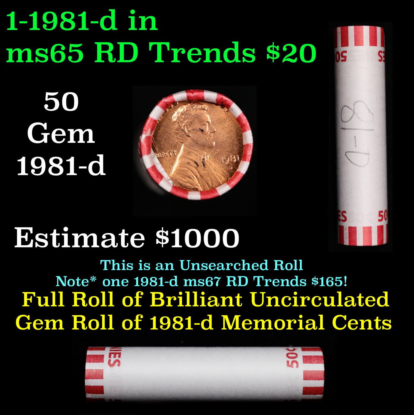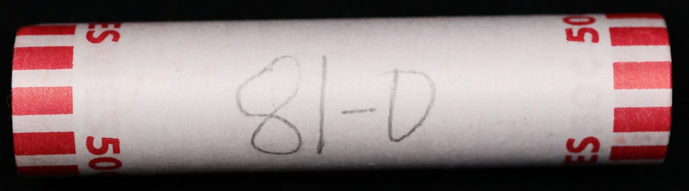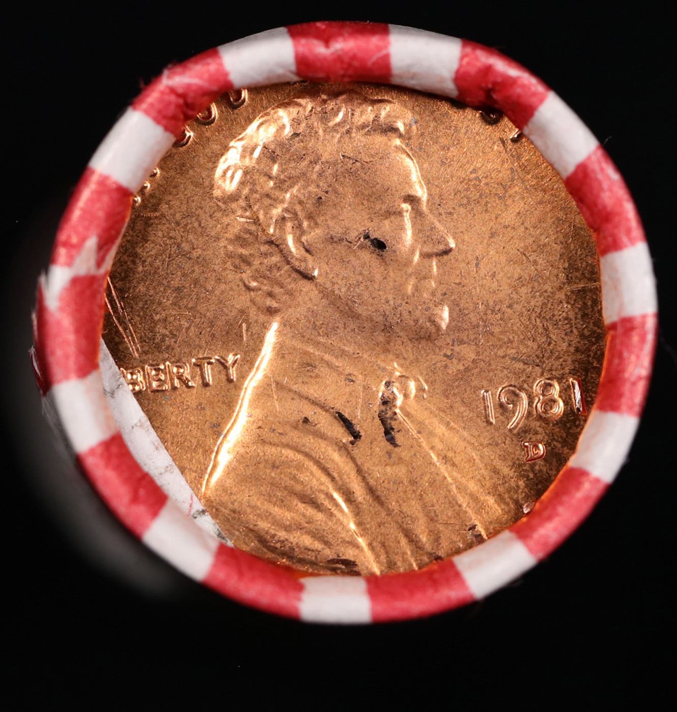 Shotgun Lincoln 1c roll, 1981-d 50 pcs Bank Wrapper.. A terrific Shotgun roll of Lincoln cents. Most if not all coin should be cherry red.