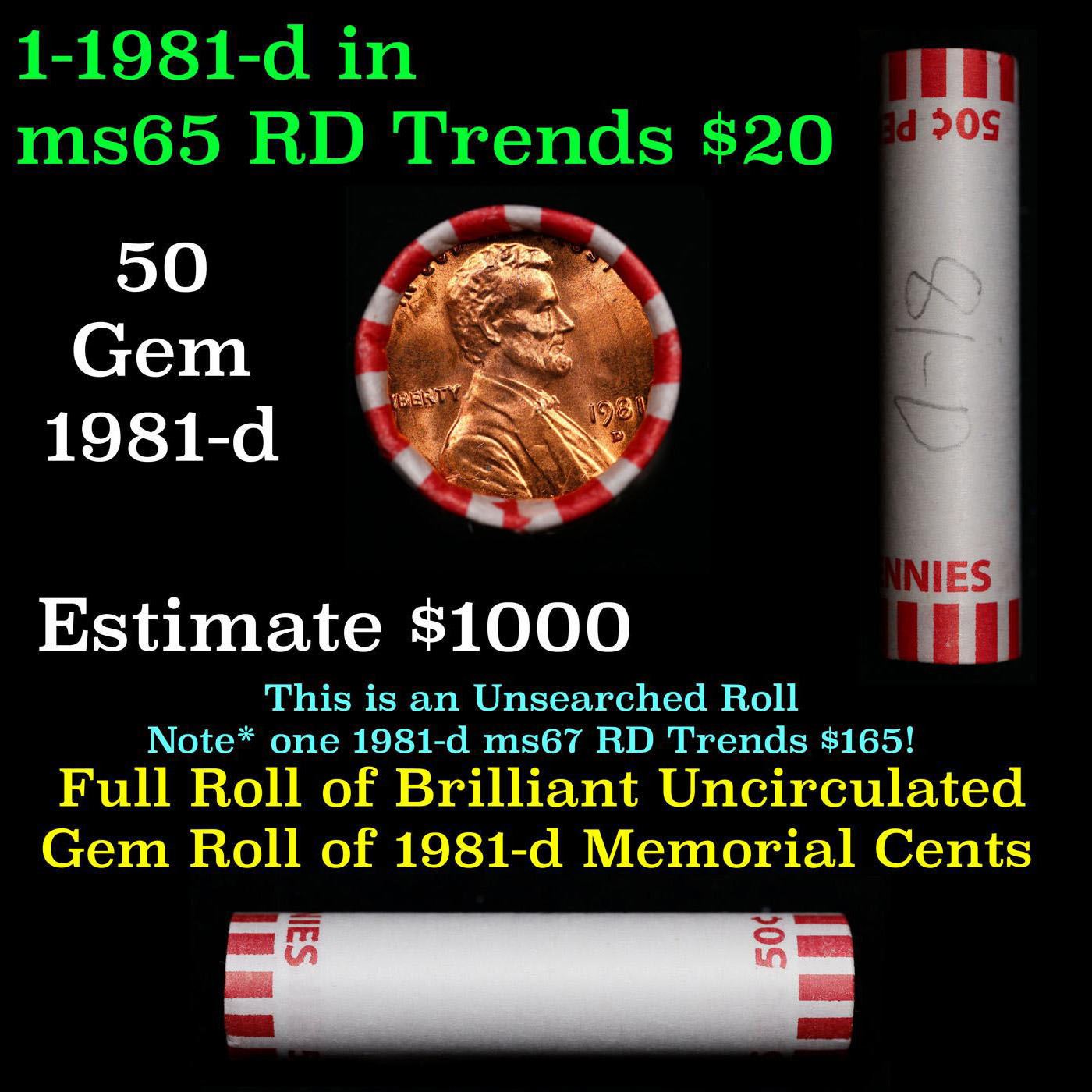 Shotgun Lincoln 1c roll, 1981-d 50 pcs Bank Wrapper.. A terrific Shotgun roll of Lincoln cents. Most if not all coin should be cherry red.