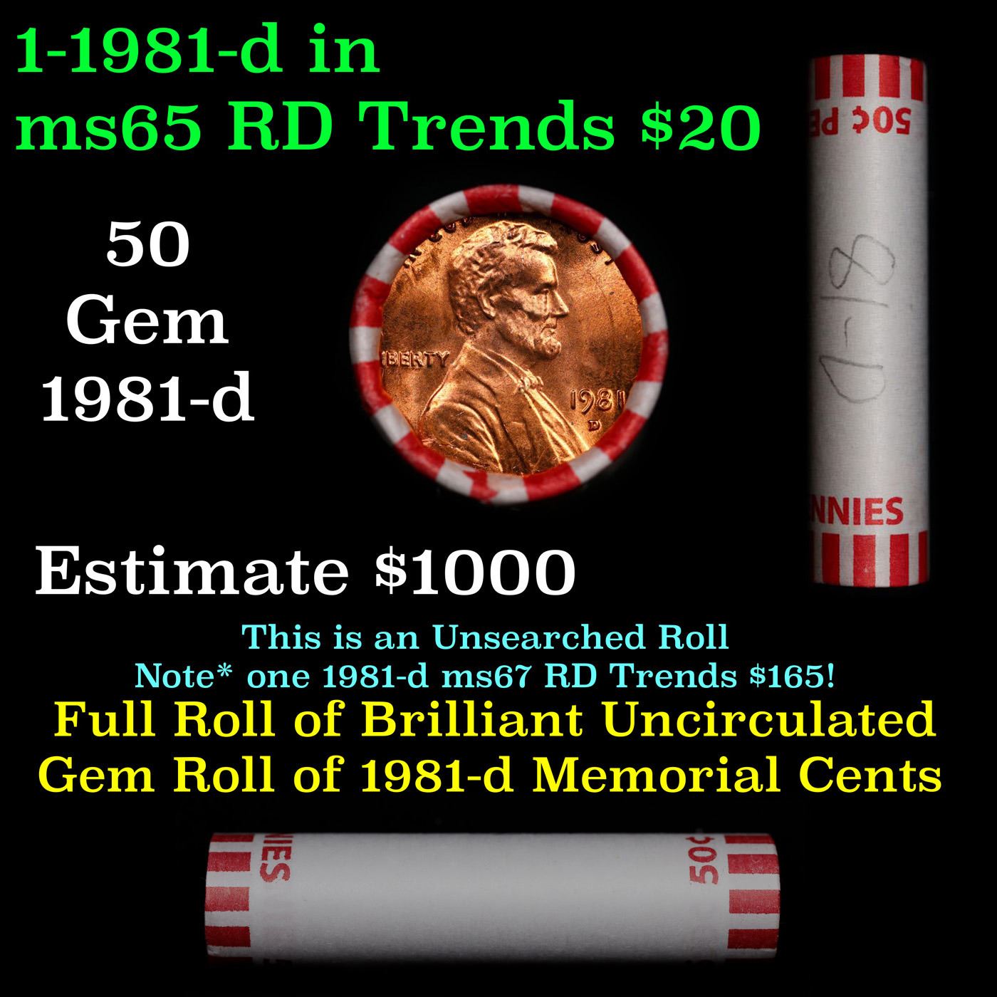 Shotgun Lincoln 1c roll, 1981-d 50 pcs Bank Wrapper.. A terrific Shotgun roll of Lincoln cents. Most if not all coin should be cherry red.