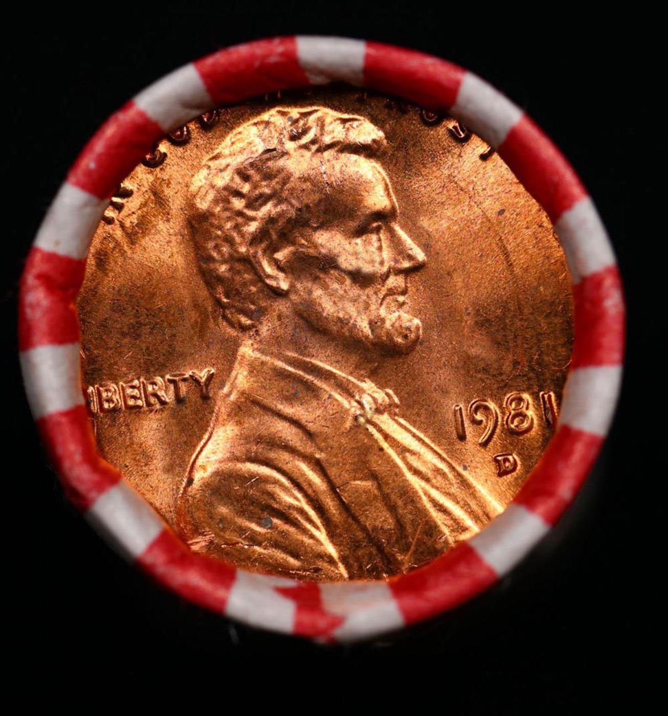 Shotgun Lincoln 1c roll, 1981-d 50 pcs Bank Wrapper.. A terrific Shotgun roll of Lincoln cents. Most if not all coin should be cherry red.