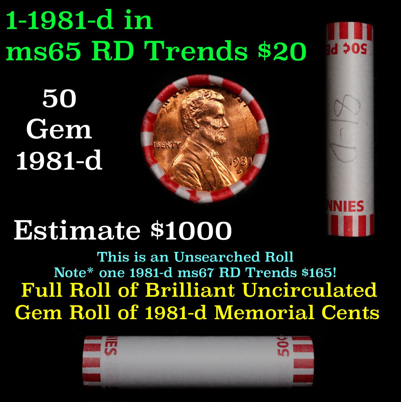 Shotgun Lincoln 1c roll, 1981-d 50 pcs Bank Wrapper.. A terrific Shotgun roll of Lincoln cents. Most if not all coin should be cherry red.