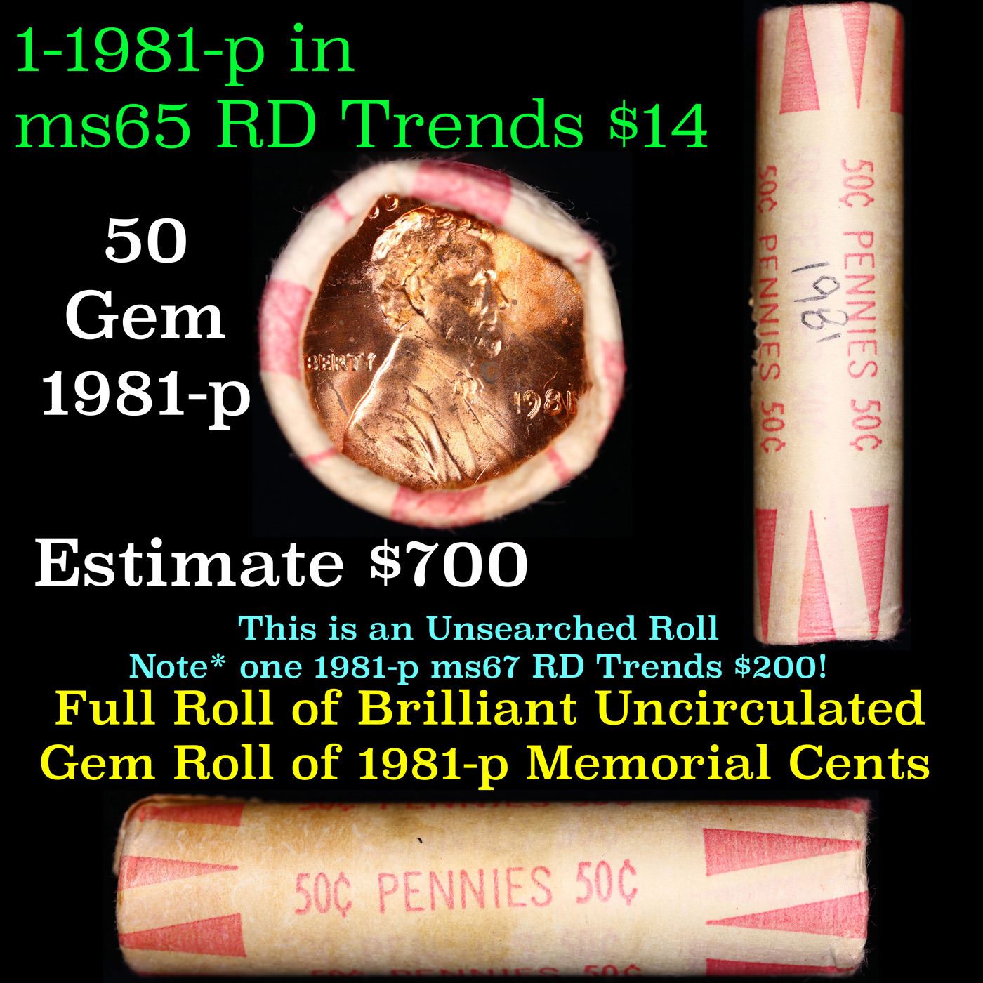 Shotgun Lincoln 1c roll, 1981-p 50 pcs Brandt Wrapper . A terrific Shotgun roll of Lincoln cents. All coins cherry red. Trends ms65 rd $14