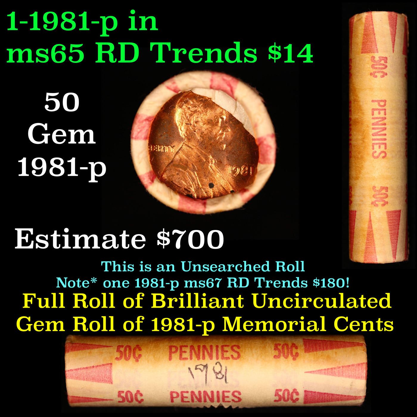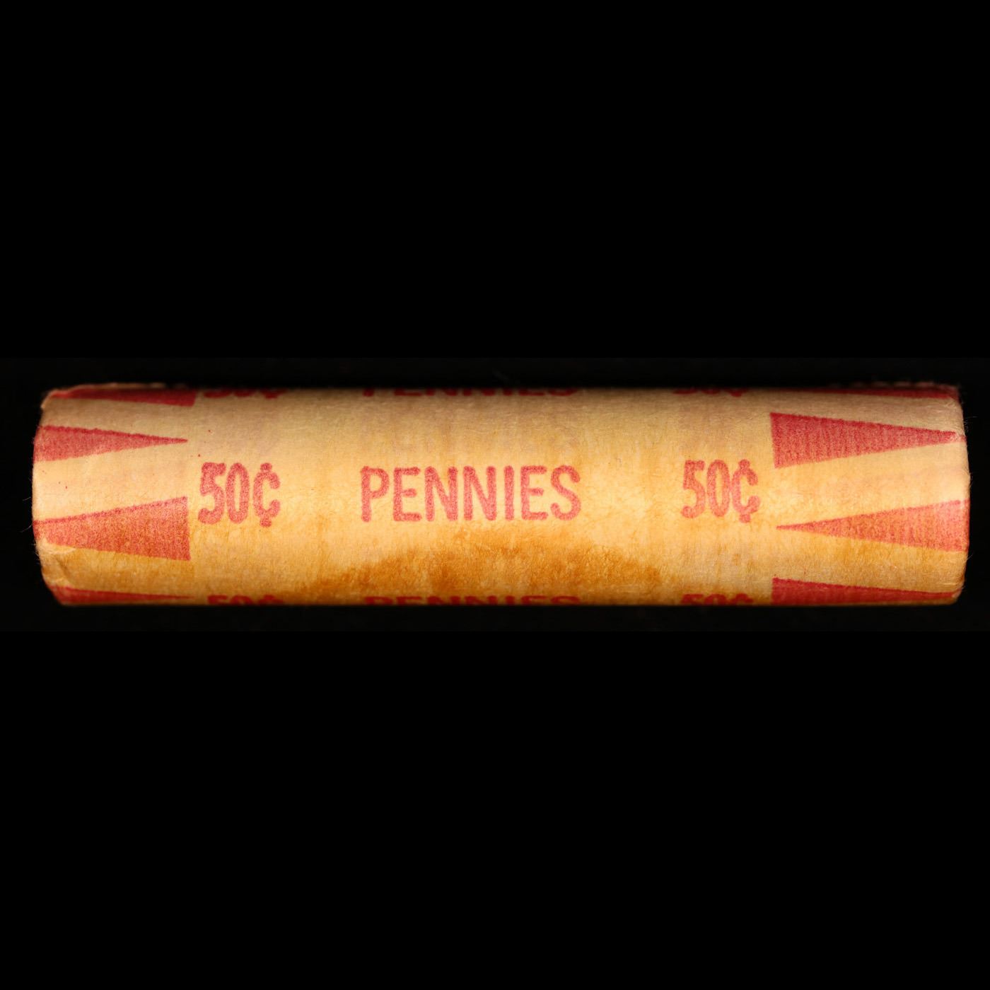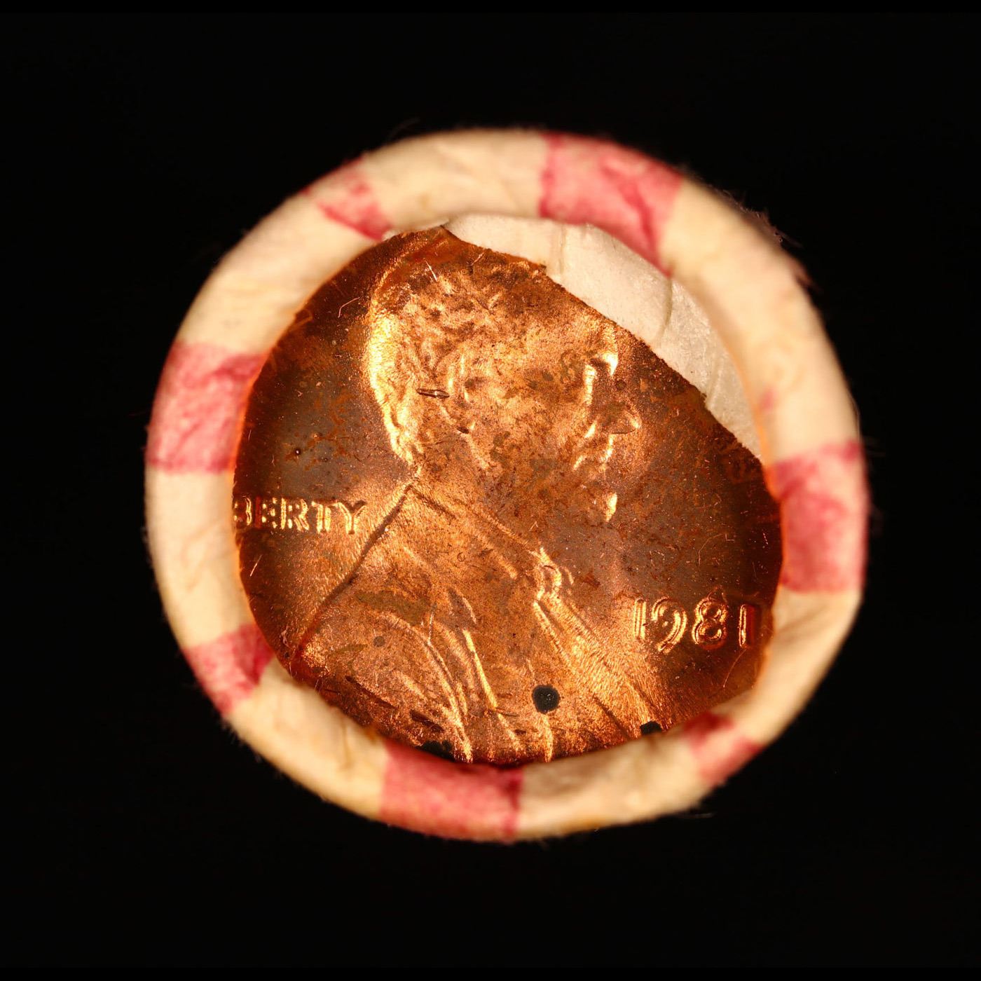Shotgun Lincoln 1c roll, 1981-p 50 pcs Old Bank Style Coin Wrapper. A terrific Shotgun roll of Lincoln cents. All coins cherry red. Trends ms65 rd $16