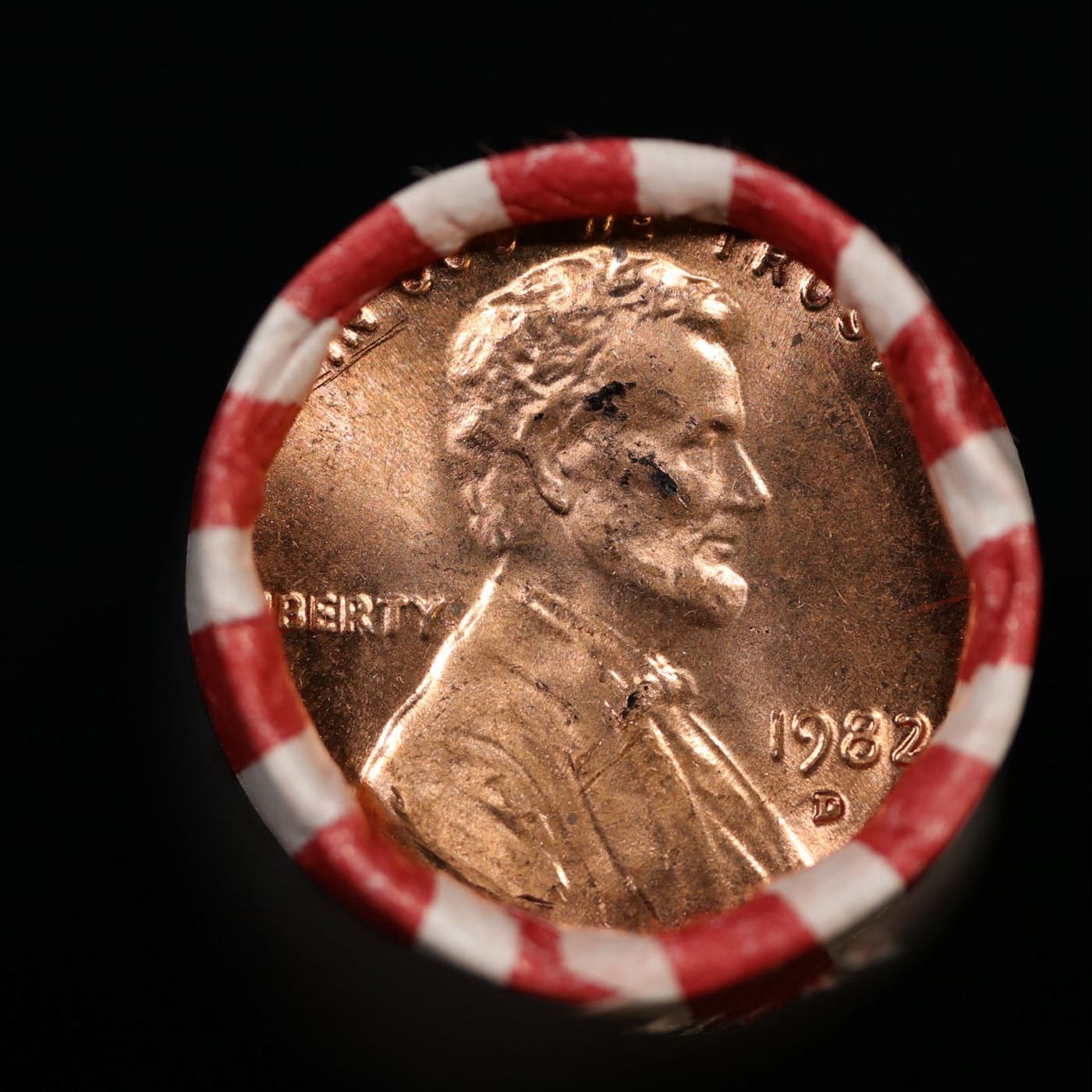 Shotgun Lincoln 1c roll, 1982-d 50 pcs Bank Wrapper.. A terrific Shotgun roll of Lincoln cents. Most if not all coin should be cherry red.