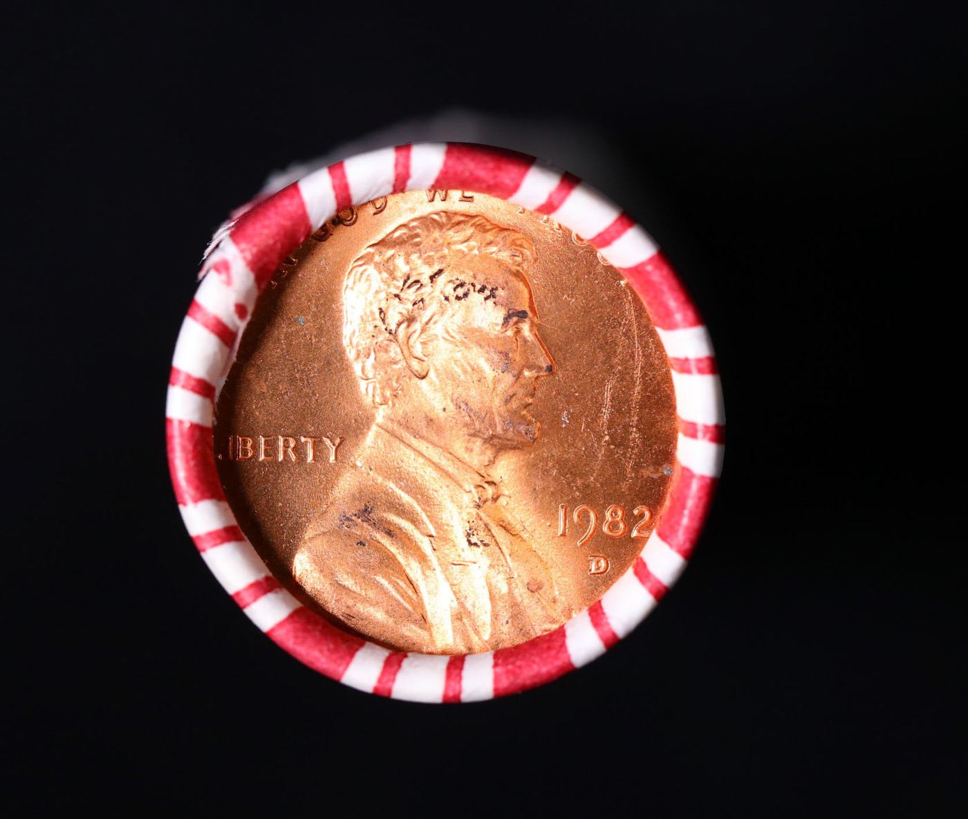 Shotgun Lincoln 1c roll, 1982-d 50 pcs Brandt 50c Wrapper.. A terrific Shotgun roll of Lincoln cents. Most if not all coin should be cherry red.