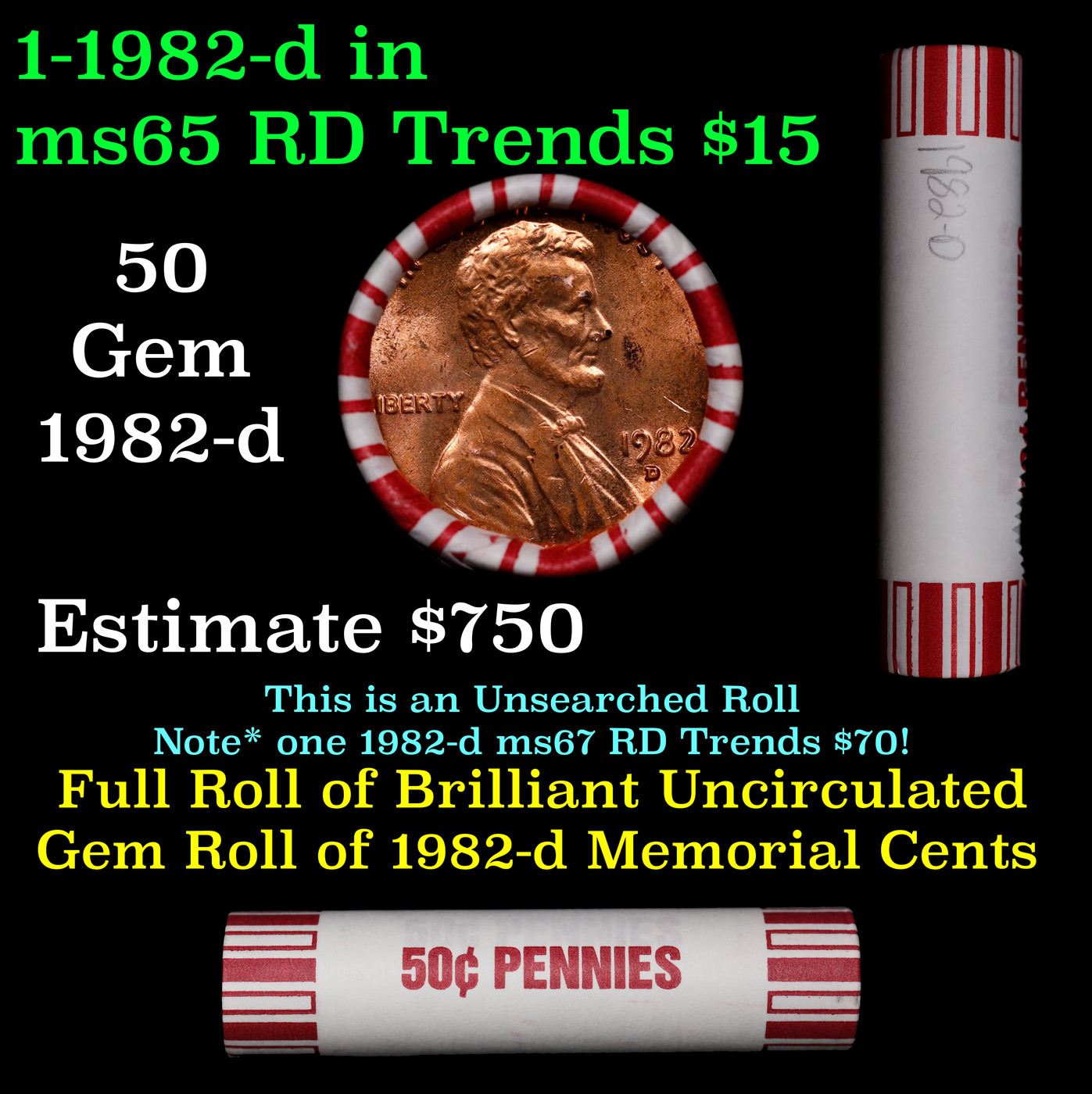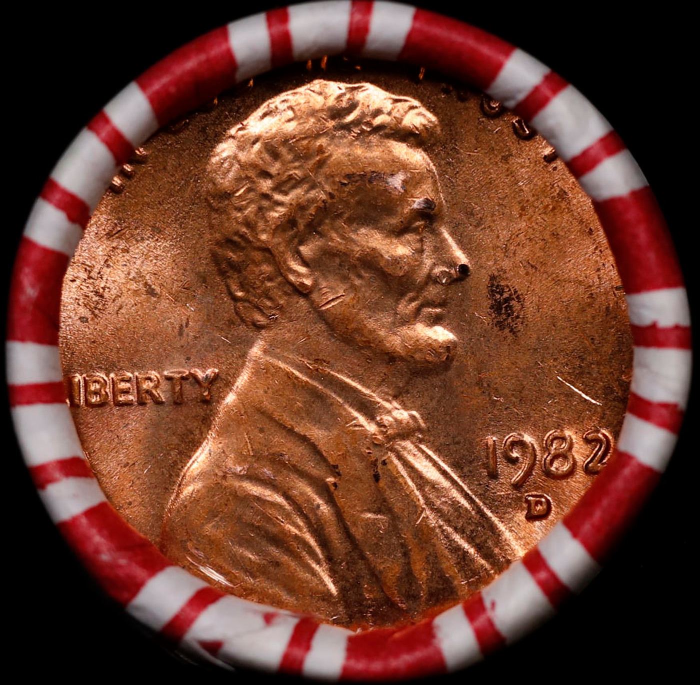 Shotgun Lincoln 1c roll, 1982-d 50 pcs Brandt 50c Wrapper.. A terrific Shotgun roll of Lincoln cents. Most if not all coin should be cherry red.