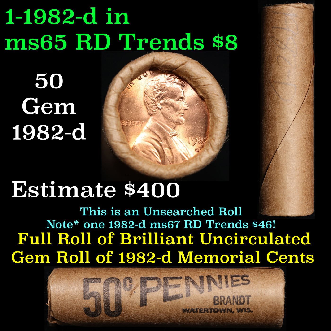 Shotgun Lincoln 1c roll, 1982-d 50 pcs Brandt Wrapper .