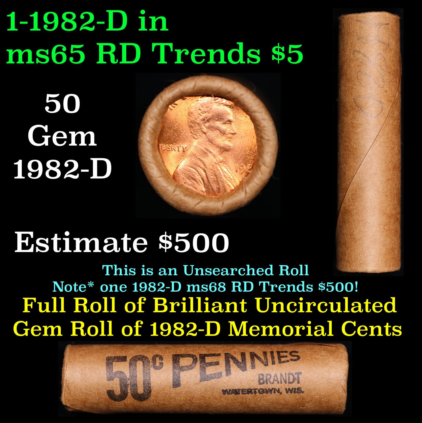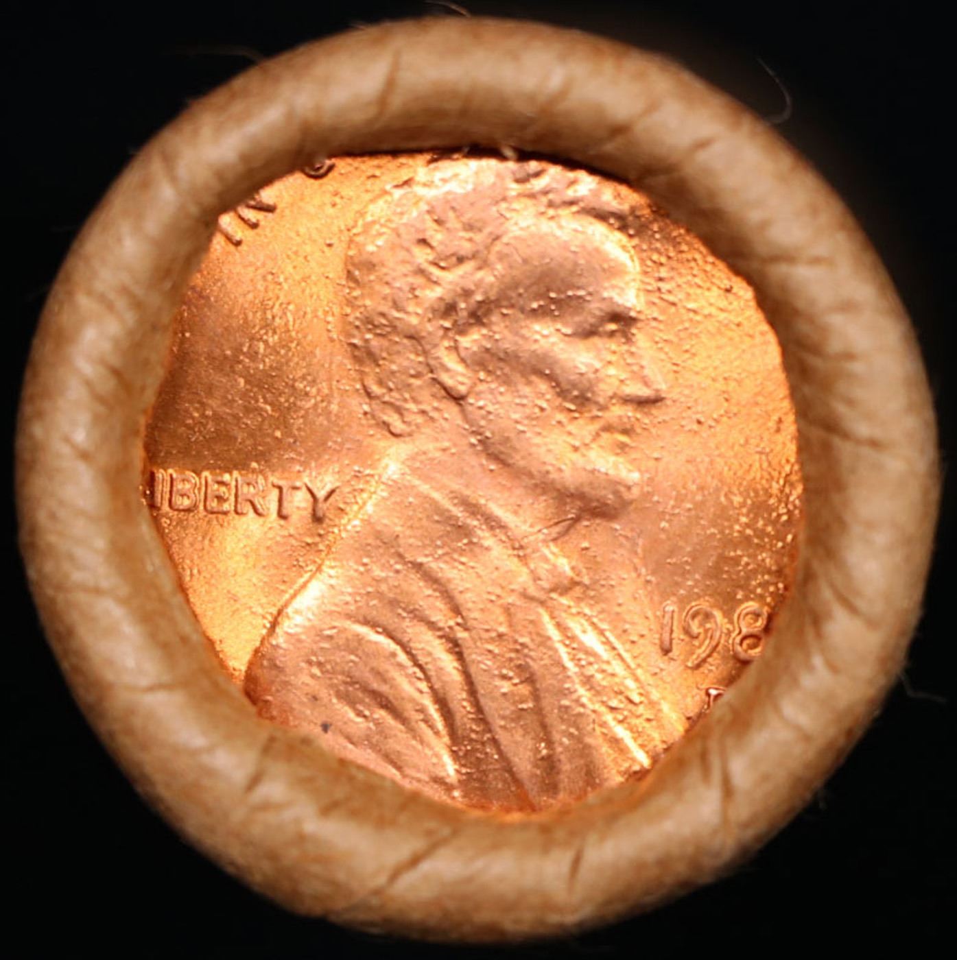 Shotgun Lincoln 1c roll, 1982-d 50 pcs Brandt Wrapper . A terrific Shotgun roll of Lincoln cents. All coins cherry red. Trends ms65 rd $12