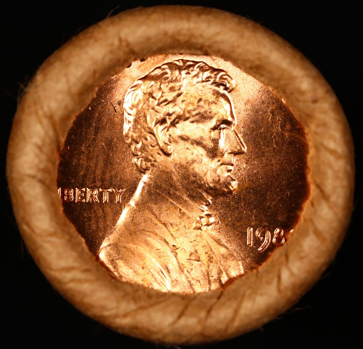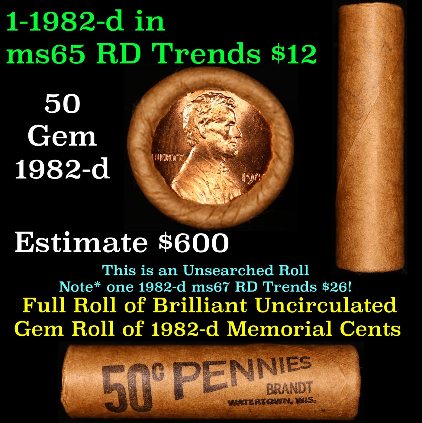 Shotgun Lincoln 1c roll, 1982-d 50 pcs Brandt Wrapper . A terrific Shotgun roll of Lincoln cents. All coins cherry red. Trends ms65 rd $12
