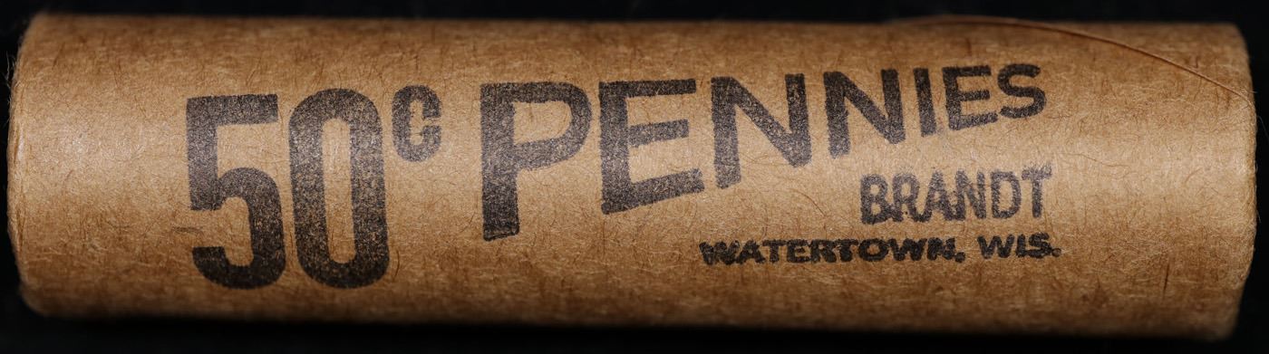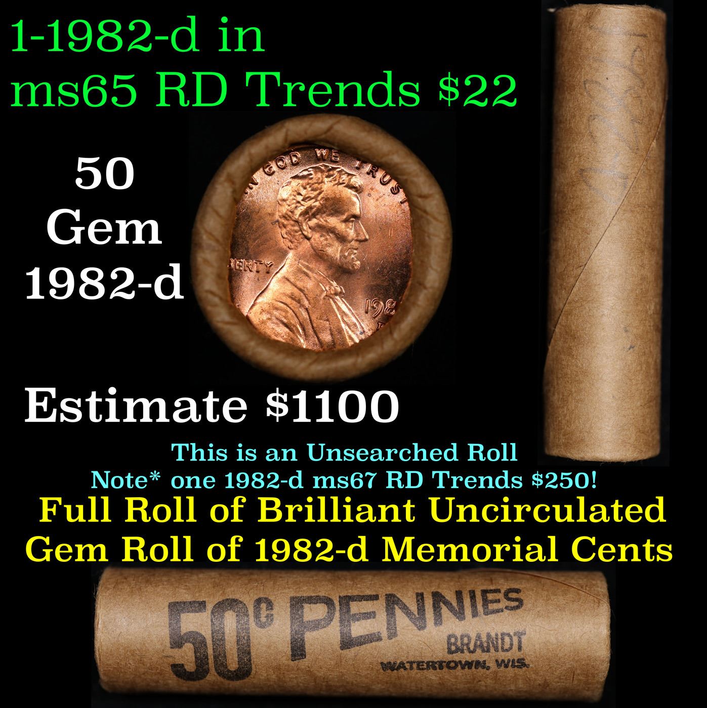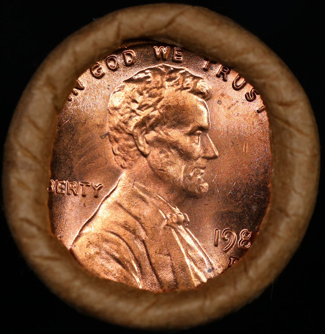 Shotgun Lincoln 1c roll, 1982-d 50 pcs Brandt Wrapper . A terrific Shotgun roll of Lincoln cents. All coins cherry red. Trends ms65 rd $12