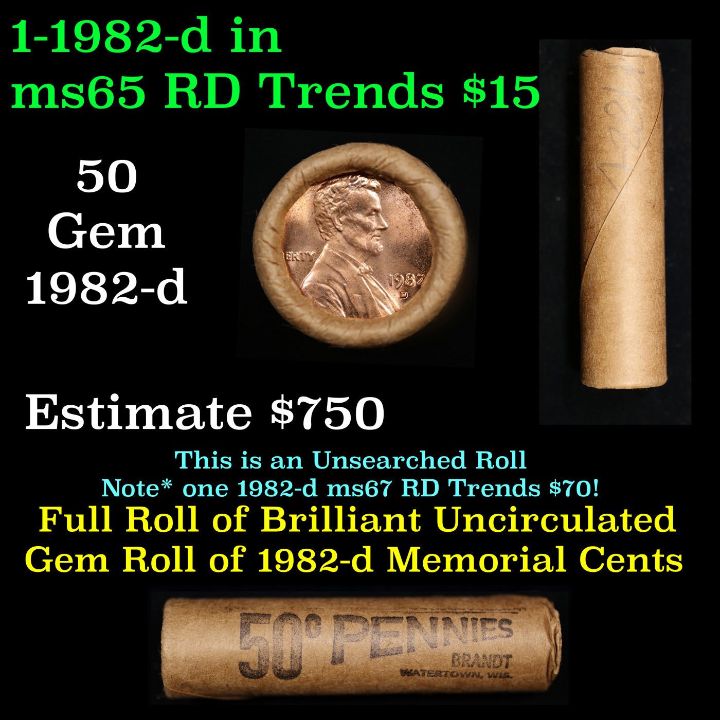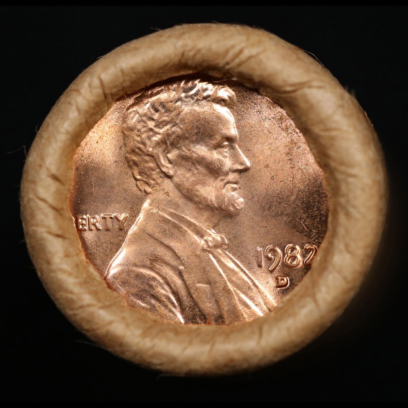 Shotgun Lincoln 1c roll, 1982-d 50 pcs Brandt Wrapper.. A terrific Shotgun roll of Lincoln cents. Most if not all coin should be cherry red. Trends ms65 rd $12