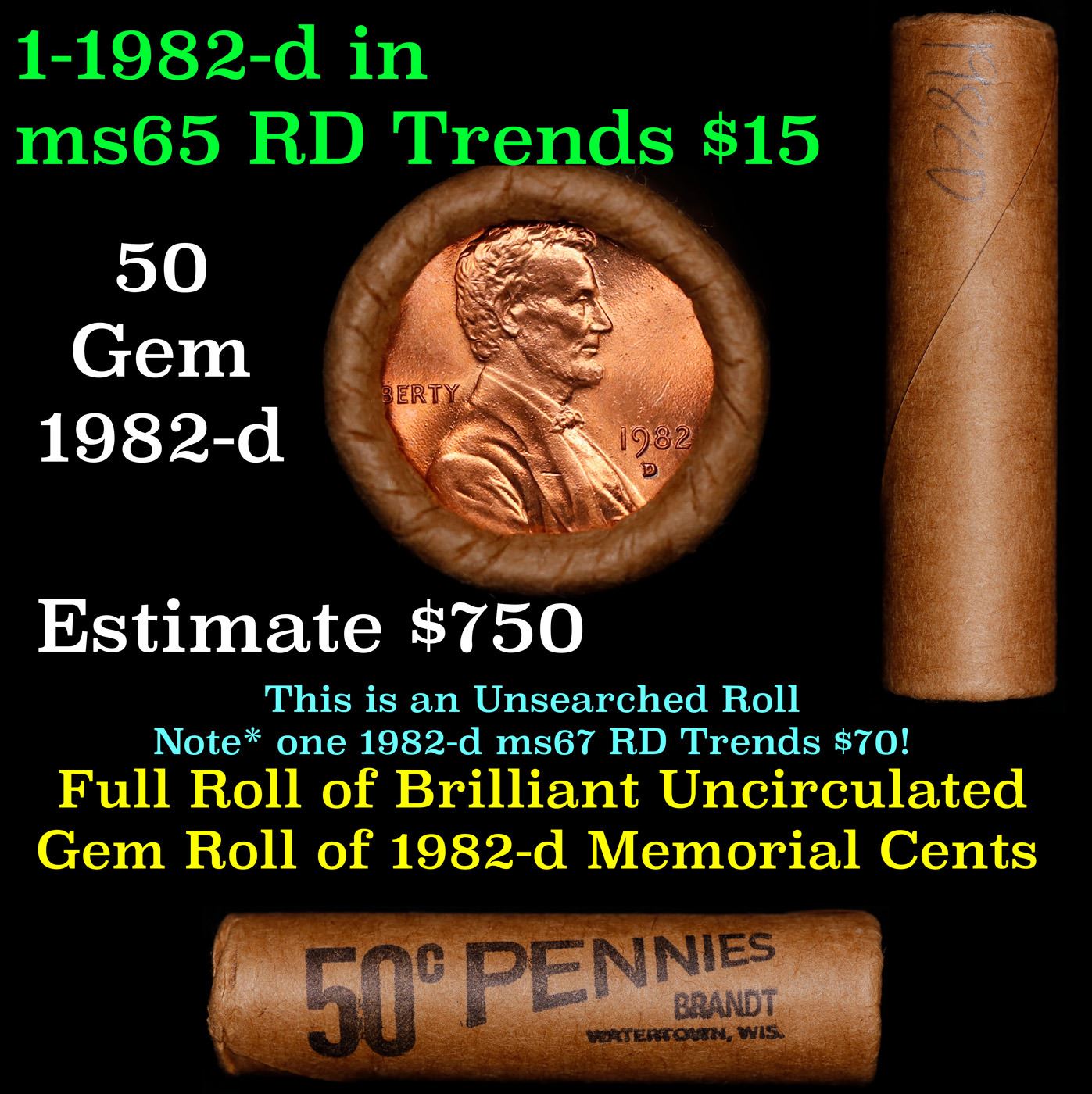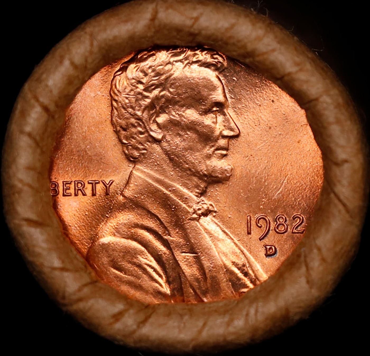 Shotgun Lincoln 1c roll, 1982-d 50 pcs Brandt Wrapper.. A terrific Shotgun roll of Lincoln cents. Most if not all coin should be cherry red.