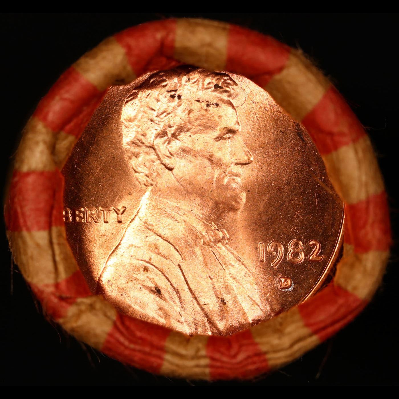 Shotgun Lincoln 1c roll, 1982-d LG Date 50 pcs Old Bank Wrapper. A terrific Shotgun roll of Lincoln cents. All coins cherry red. Trends ms65 rd $16