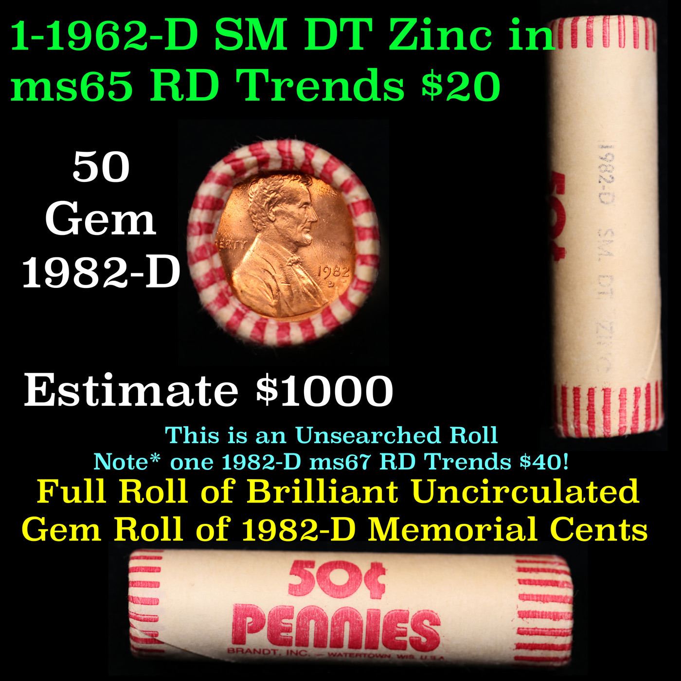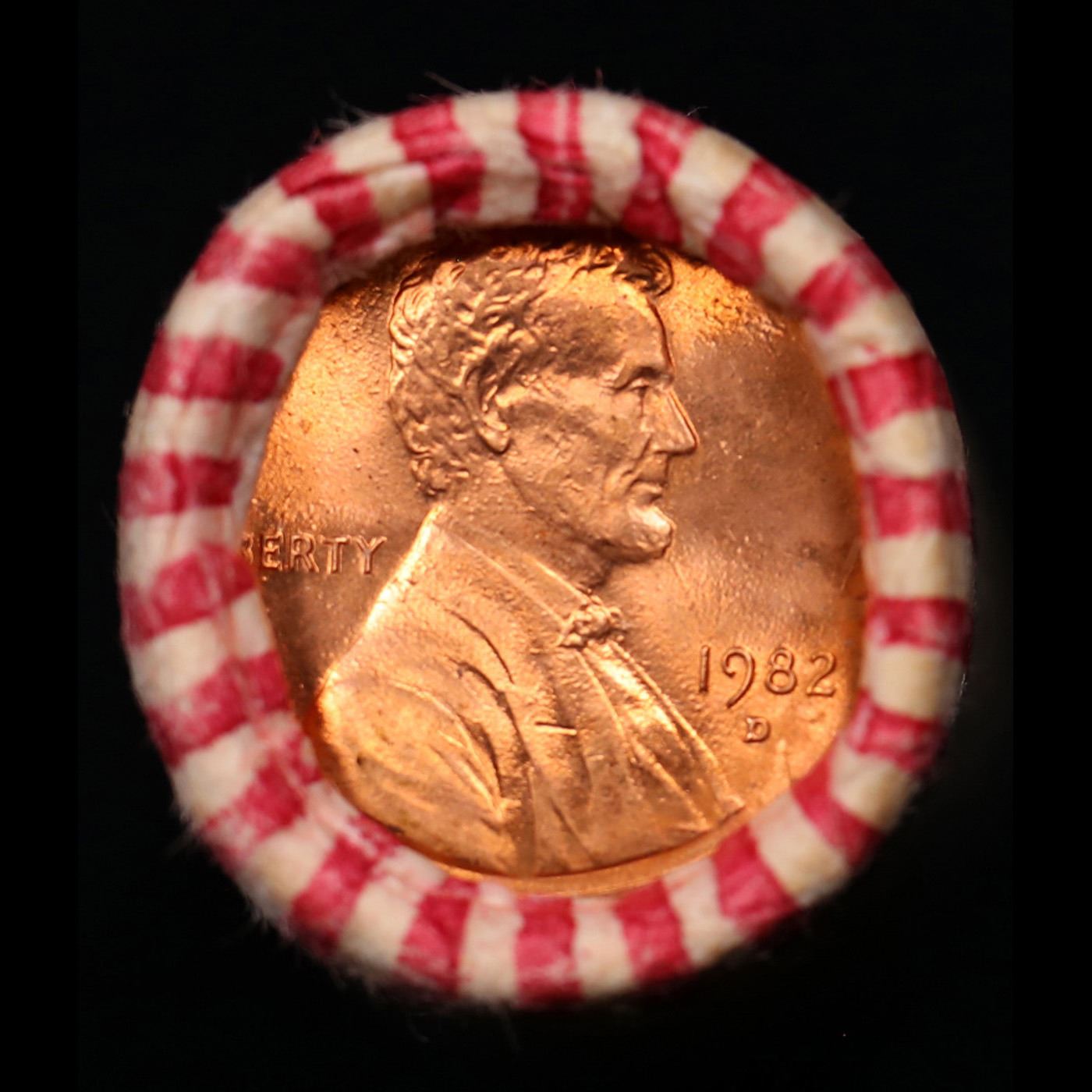 Shotgun Lincoln 1c roll, 1982-d Zinc Small date 50 pcs Brandt Wrapper. A terrific Shotgun roll of Lincoln cents. Most if not all coin should be cherry red. Trends ms65 rd $10