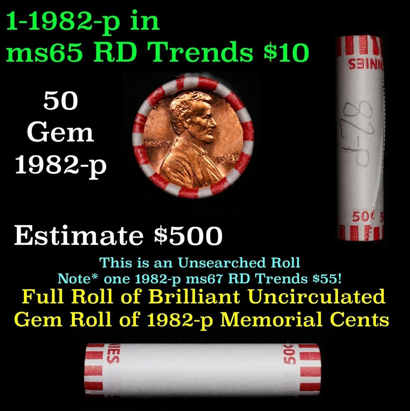 Shotgun Lincoln 1c roll, 1982-p 50 pcs Bank Wrapper.. A terrific Shotgun roll of Lincoln cents. Most if not all coin should be cherry red.