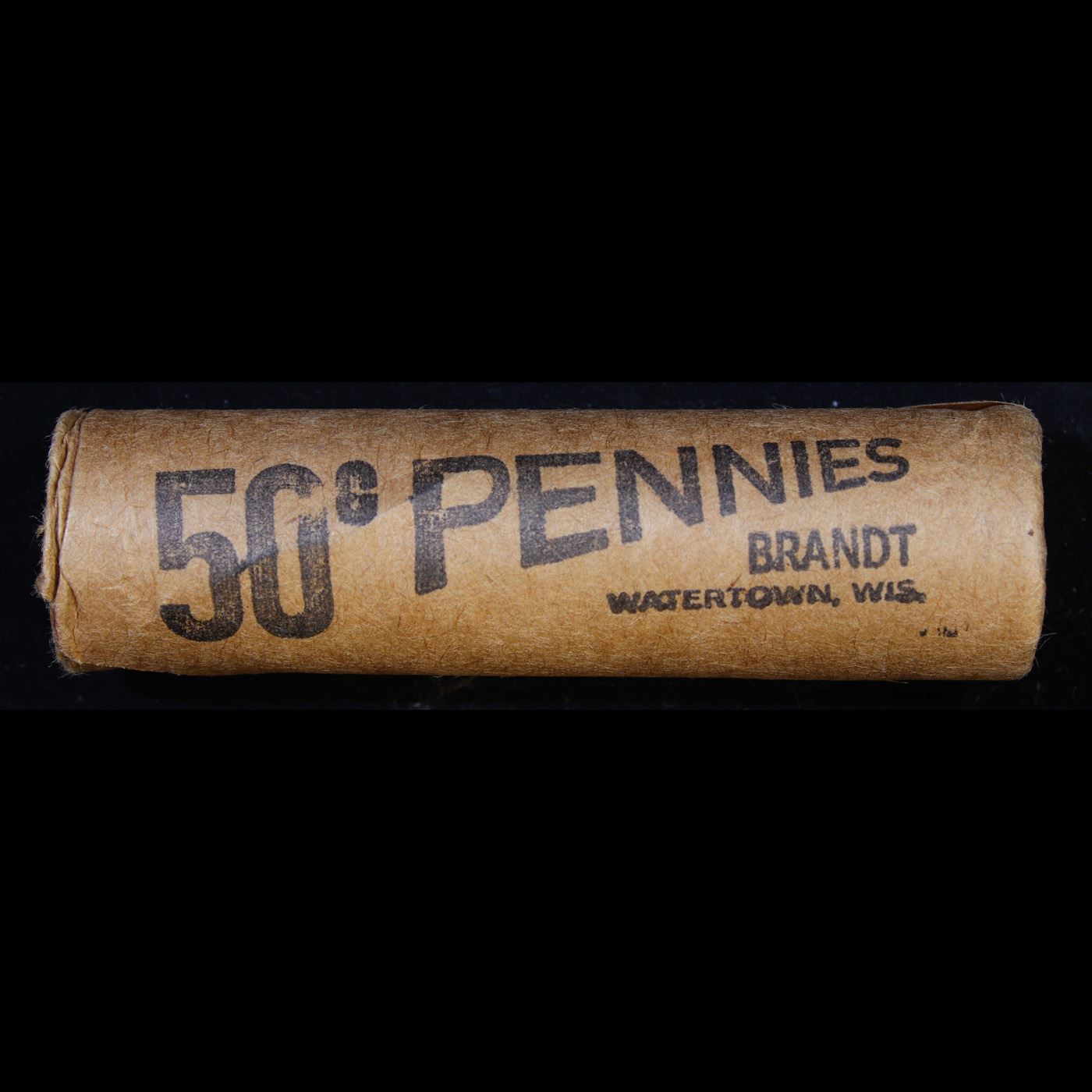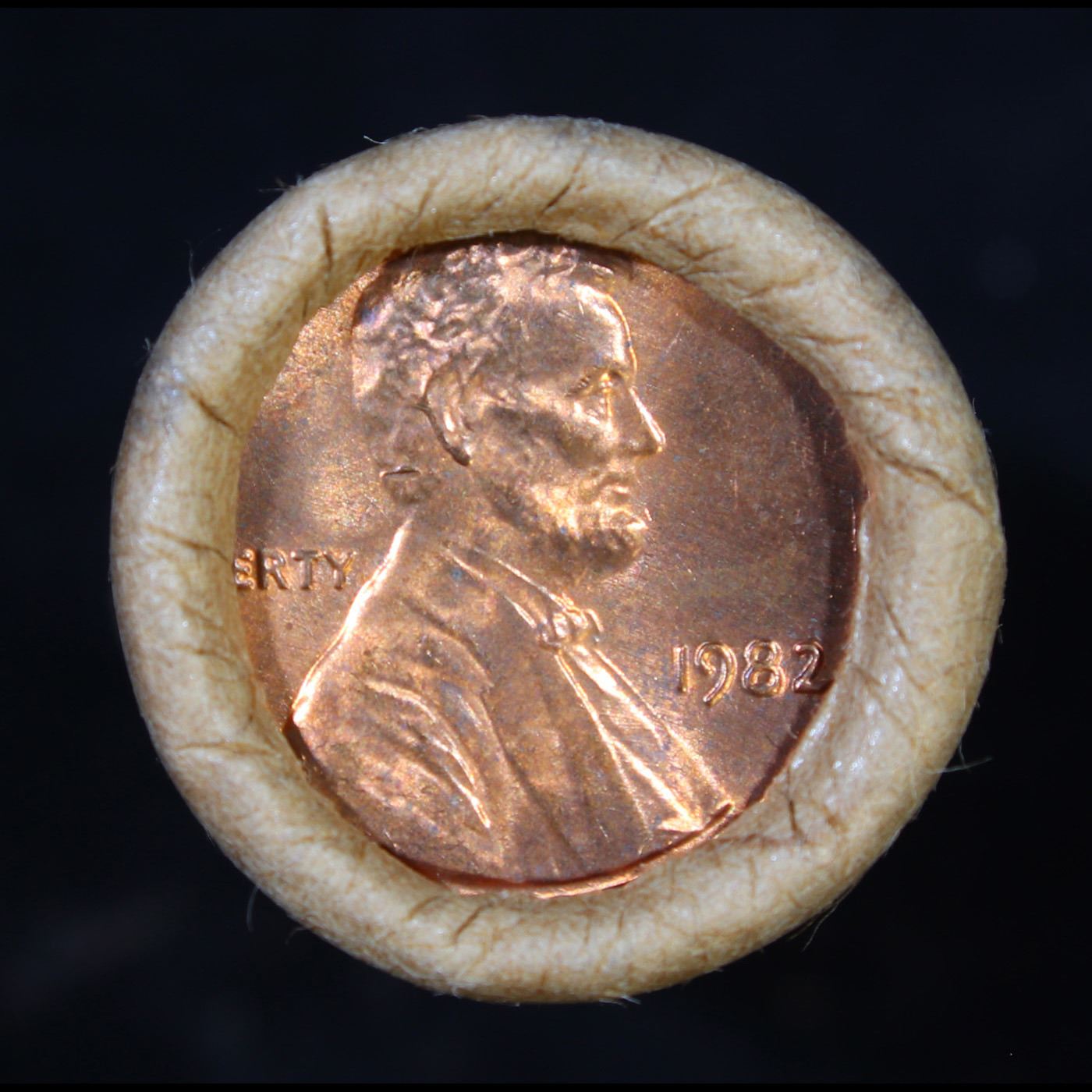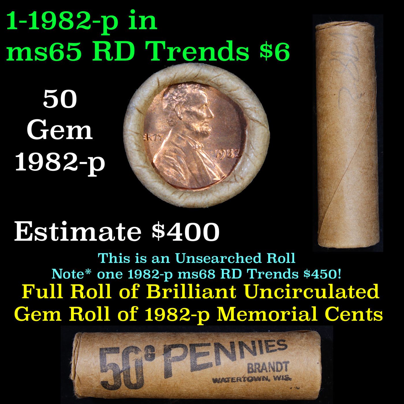 Shotgun Lincoln 1c roll, 1982-p 50 pcs Brandt Wrapper . A terrific Shotgun roll of Lincoln cents. All coins cherry red. Trends ms65 rd