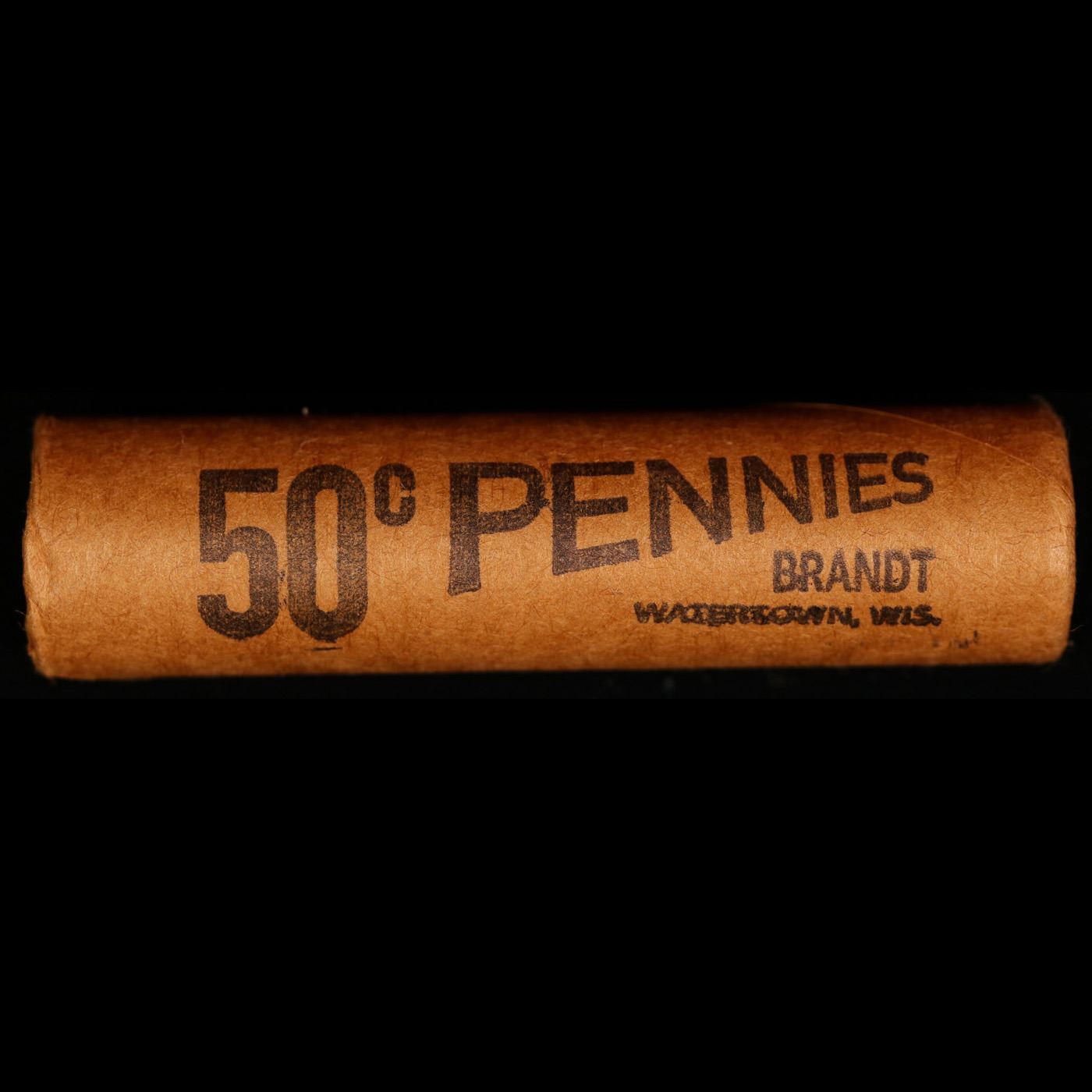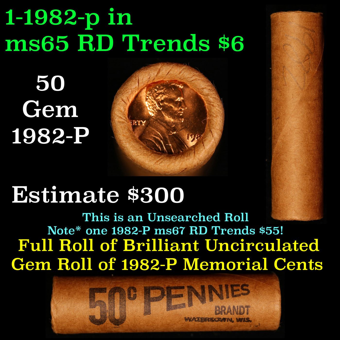 Shotgun Lincoln 1c roll, 1982-p 50 pcs Brandt Wrapper . A terrific Shotgun roll of Lincoln cents. All coins cherry red. Trends ms65 rd $6