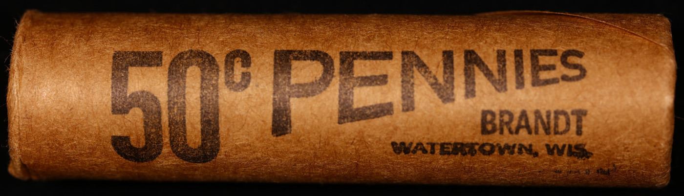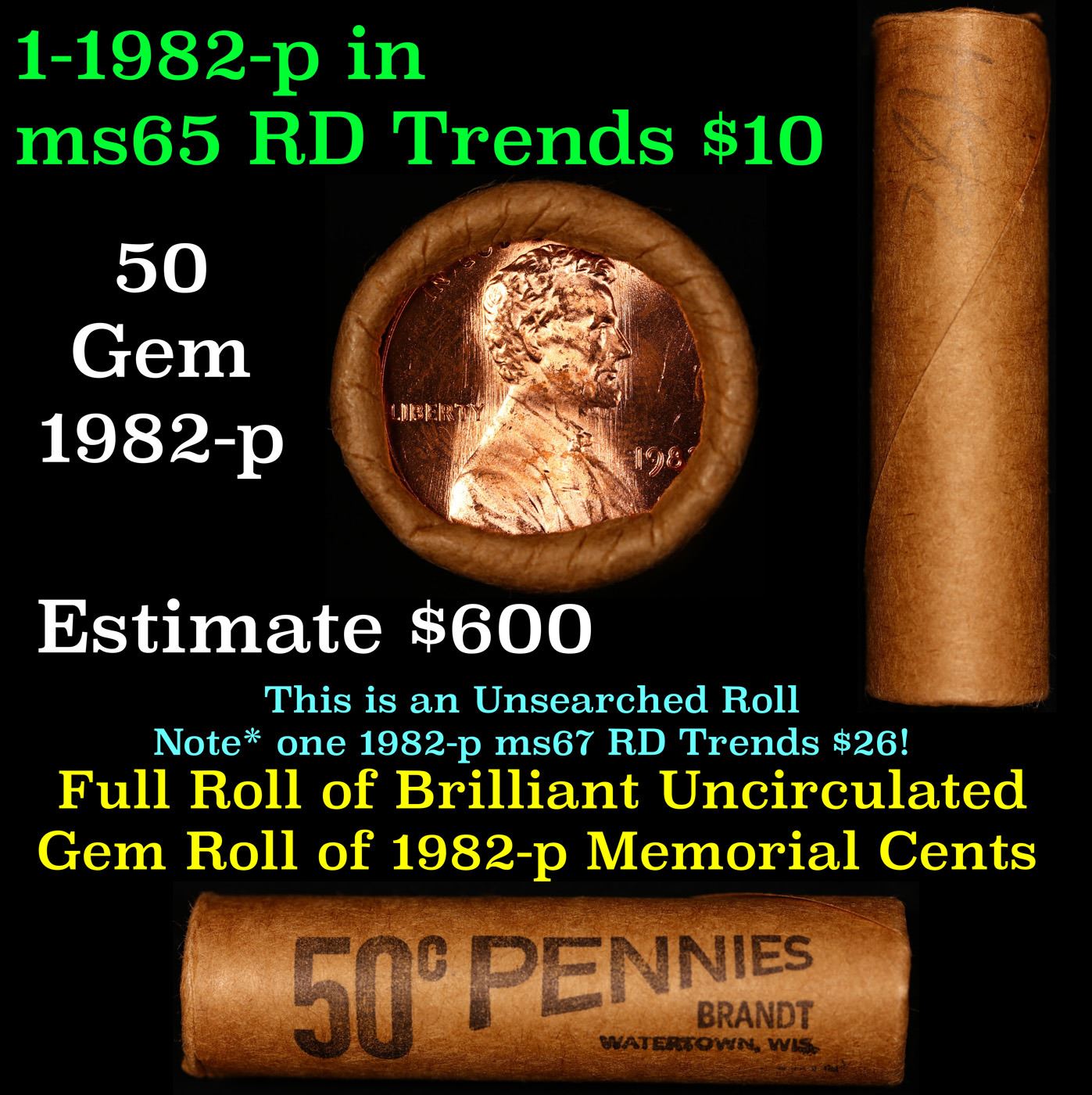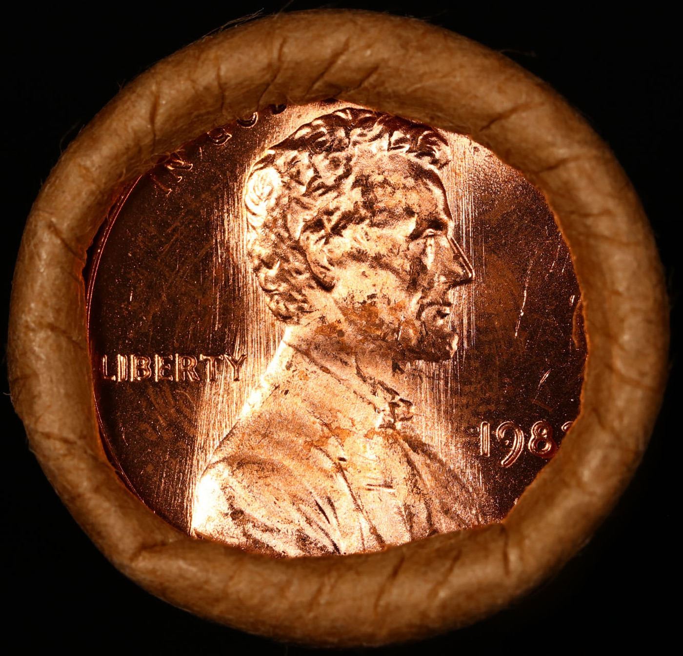 Shotgun Lincoln 1c roll, 1982-p 50 pcs Brandt Wrapper . A terrific Shotgun roll of Lincoln cents. All coins cherry red. Trends ms65 rd $10