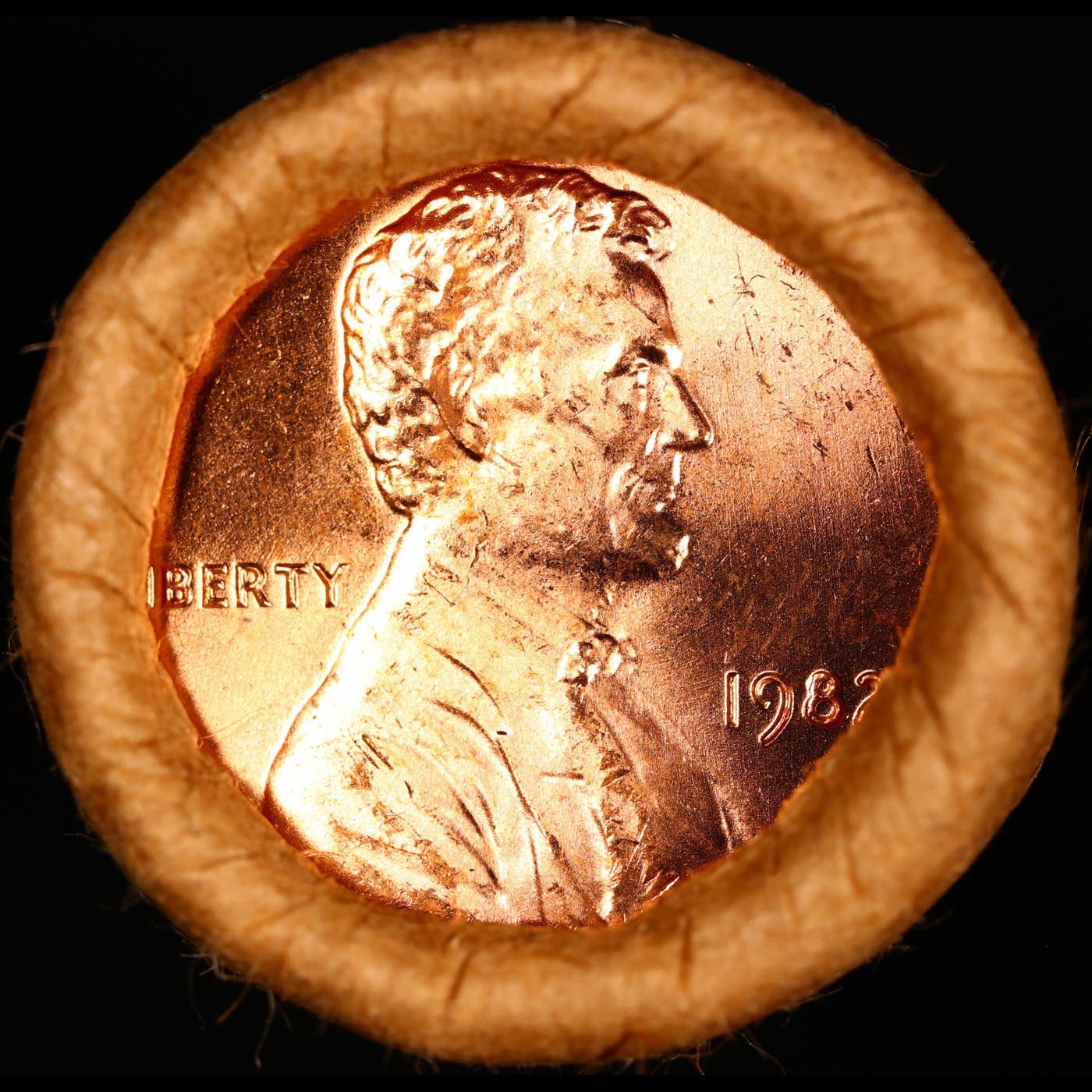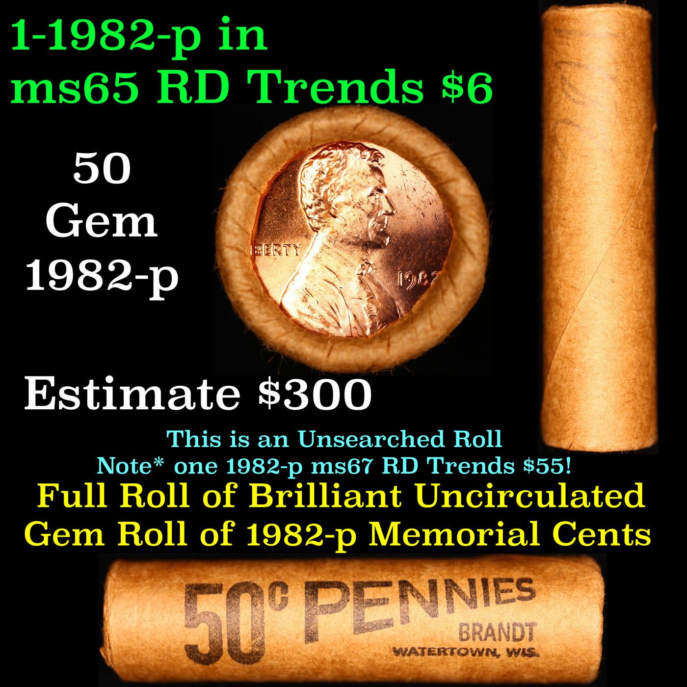 Shotgun Lincoln 1c roll, 1982-p 50 pcs Brandt Wrapper . A terrific Shotgun roll of Lincoln cents. All coins cherry red. Trends ms65 rd $6