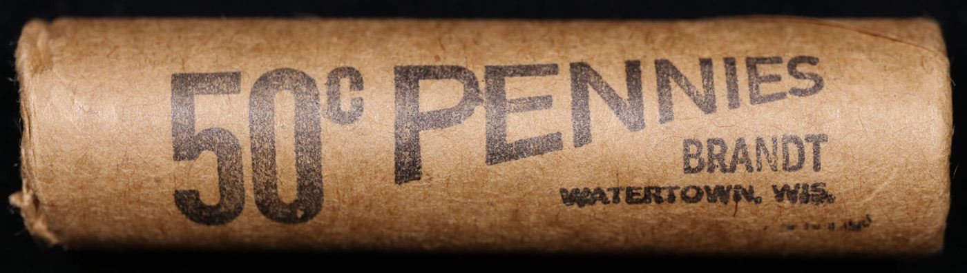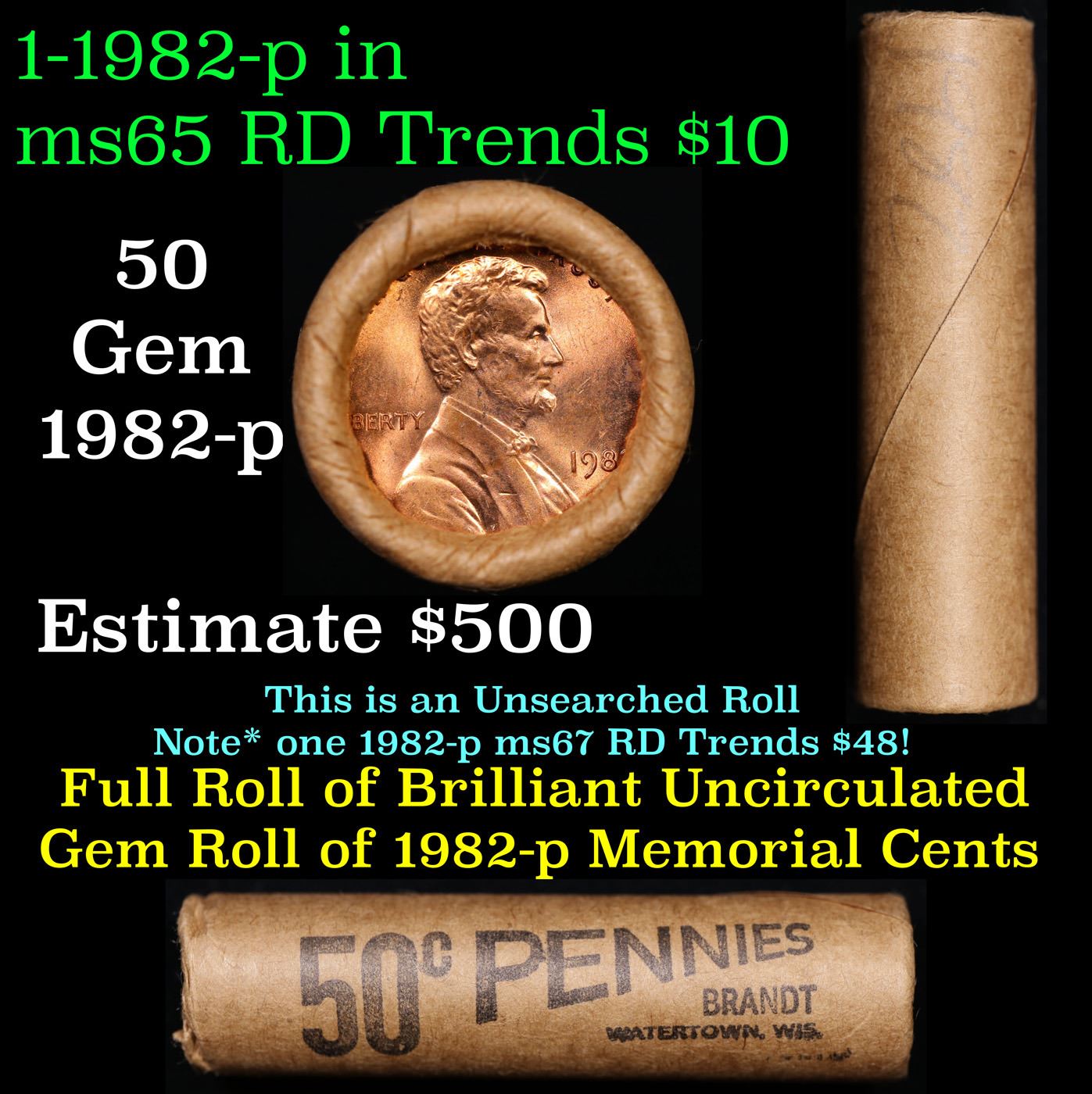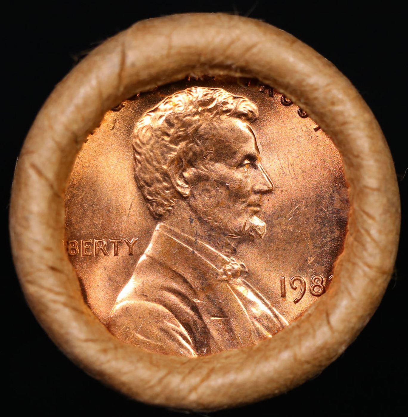 Shotgun Lincoln 1c roll, 1982-p 50 pcs Brandt Wrapper . A terrific Shotgun roll of Lincoln cents. All coins cherry red. Trends ms65 rd $6