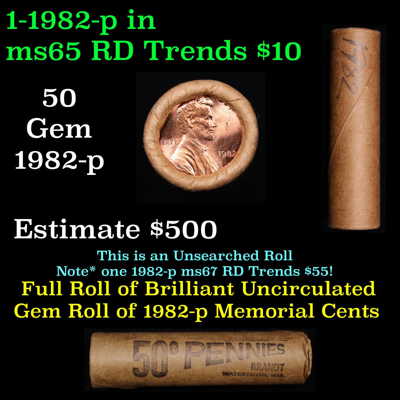 Shotgun Lincoln 1c roll, 1982-p 50 pcs Brandt Wrapper.. A terrific roll of Lincoln cents. Most if not all coin should be cherry red. Trends ms65 rd $16