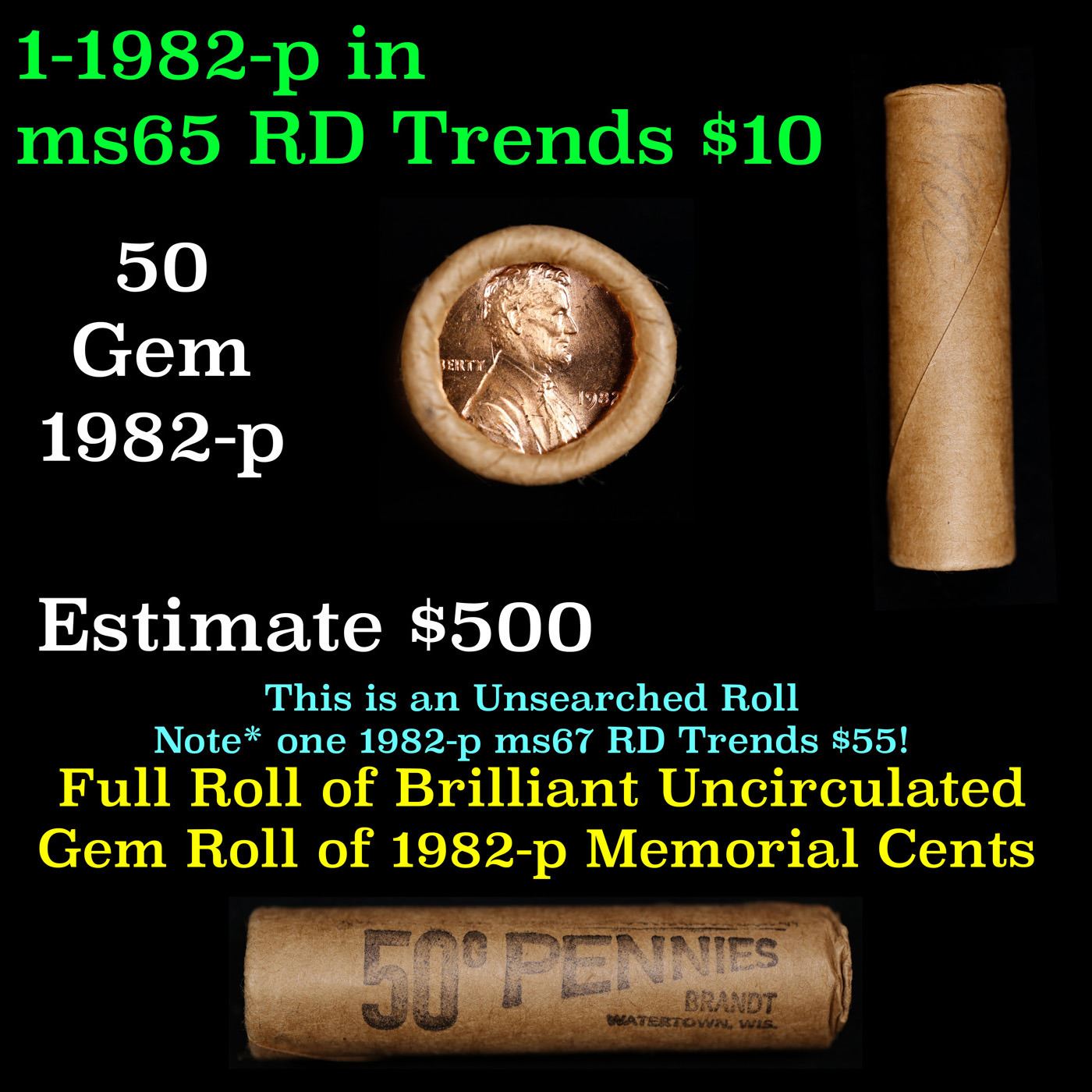 Shotgun Lincoln 1c roll, 1982-p 50 pcs Brandt Wrapper.. A terrific Shotgun roll of Lincoln cents. Most if not all coin should be cherry red. Trends ms65 rd $15