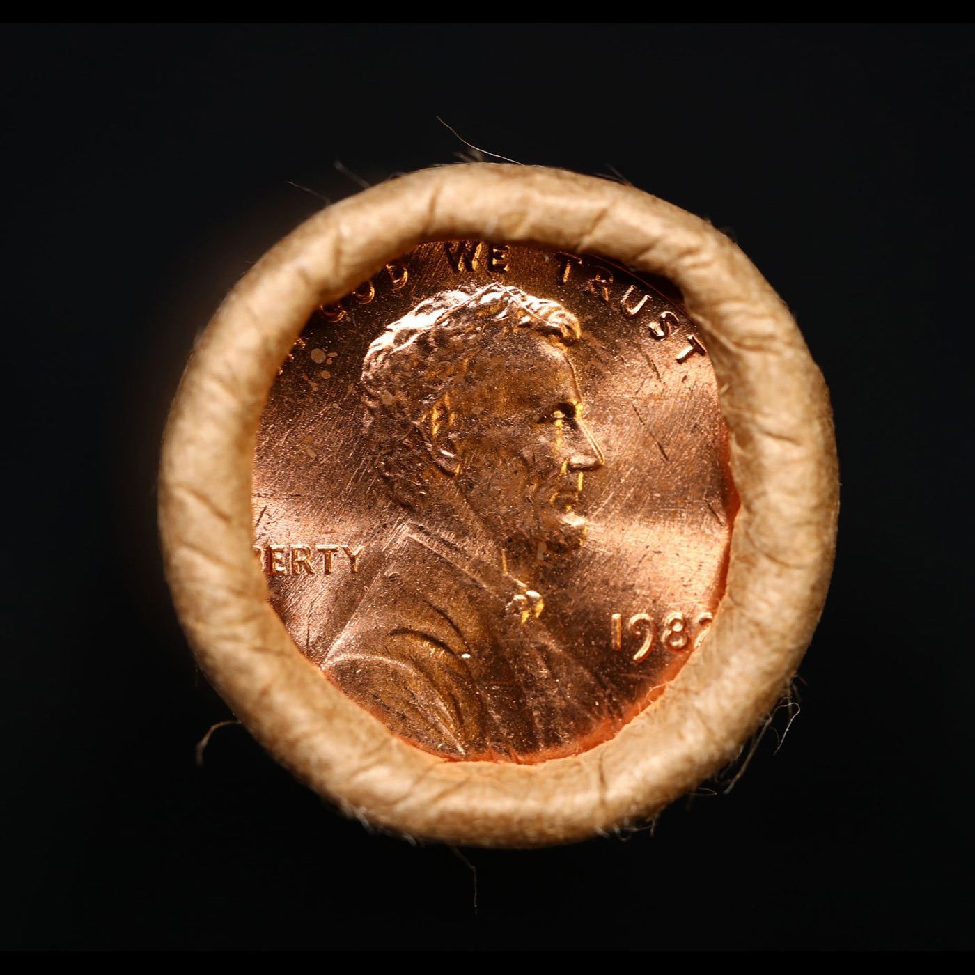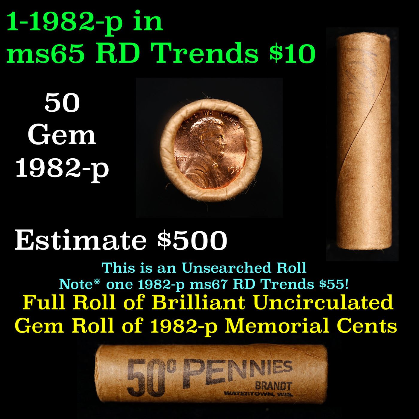 Shotgun Lincoln 1c roll, 1982-p 50 pcs Brandt Wrapper.. A terrific Shotgun roll of Lincoln cents. Most if not all coin should be cherry red.