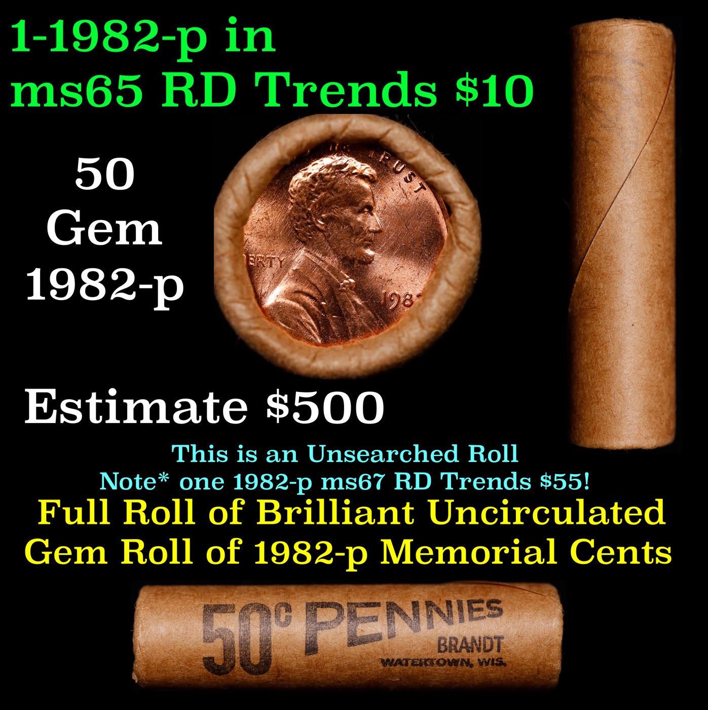 Shotgun Lincoln 1c roll, 1982-p 50 pcs Brandt Wrapper.. A terrific Shotgun roll of Lincoln cents. Most if not all coin should be cherry red.