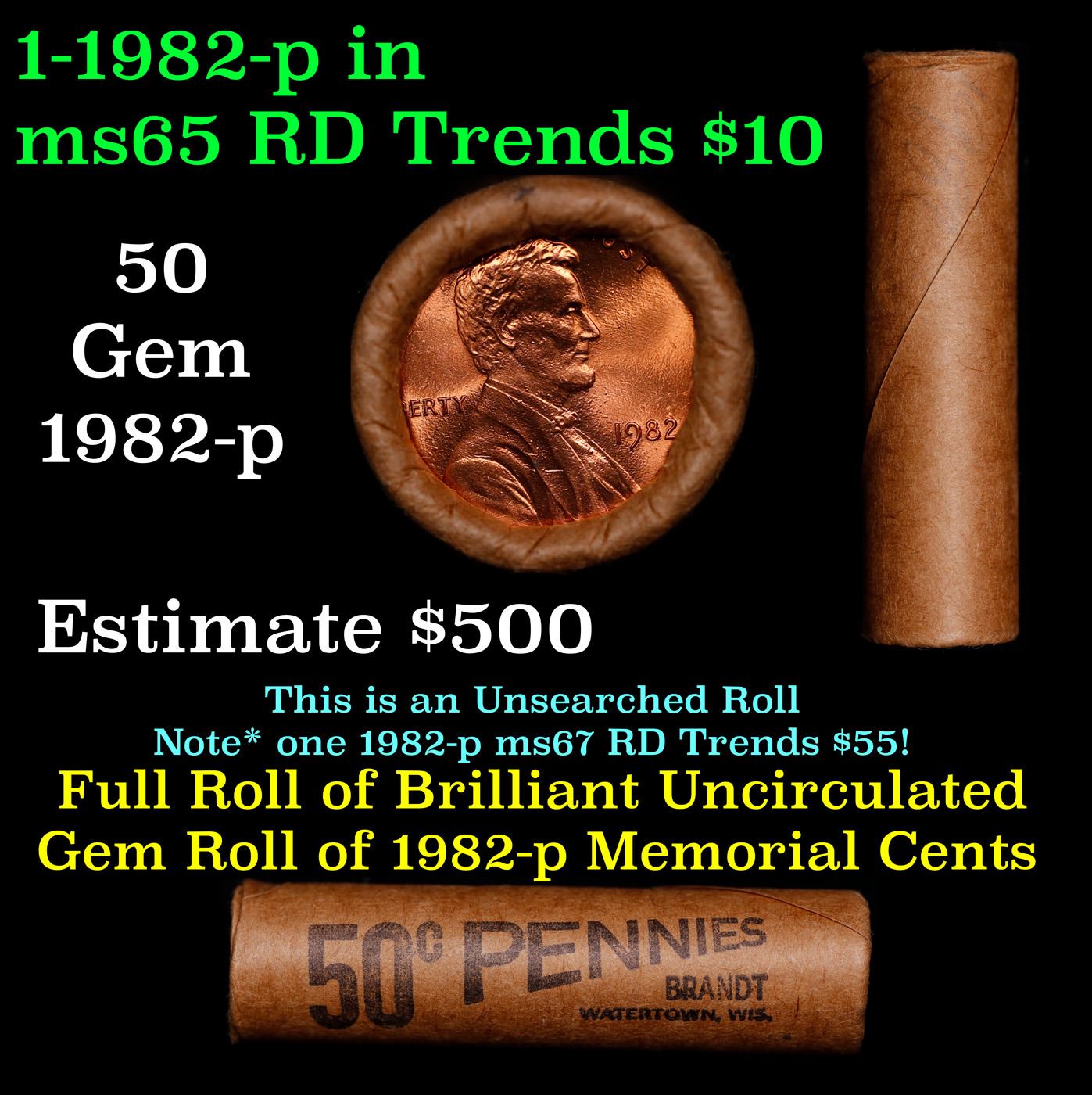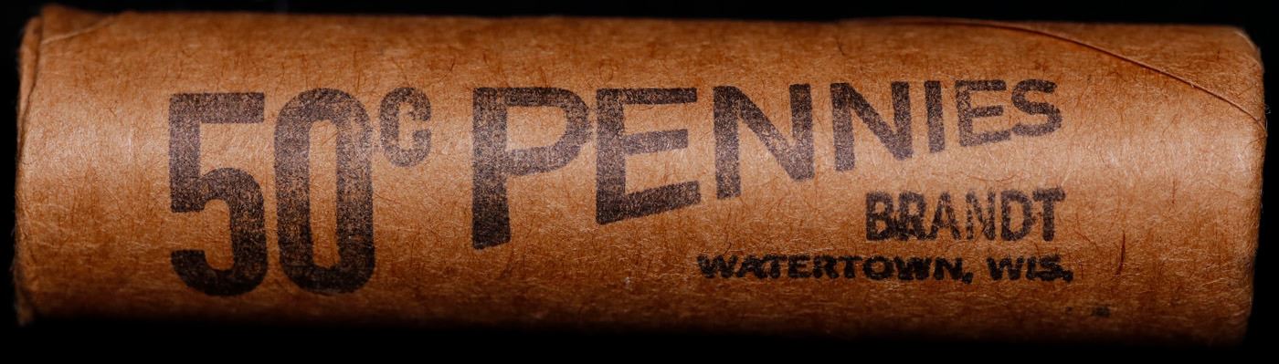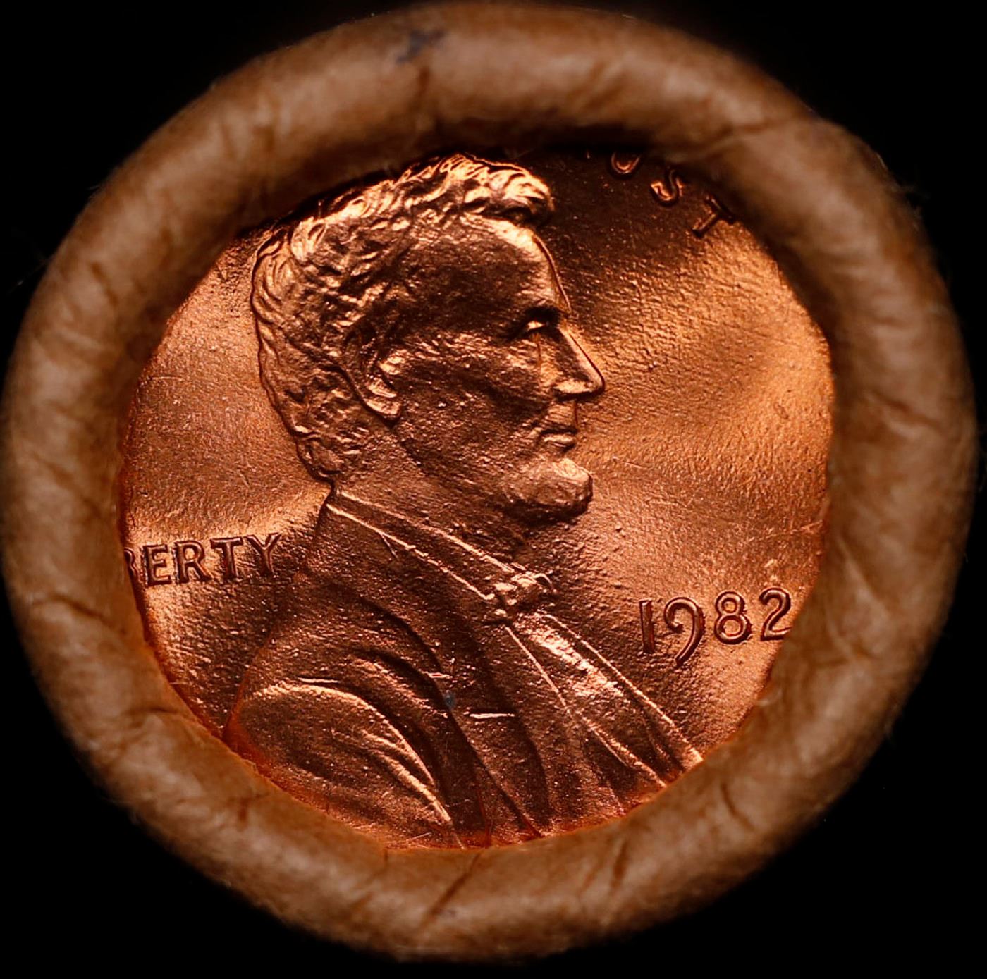 Shotgun Lincoln 1c roll, 1982-p 50 pcs Brandt Wrapper.. A terrific Shotgun roll of Lincoln cents. Most if not all coin should be cherry red.