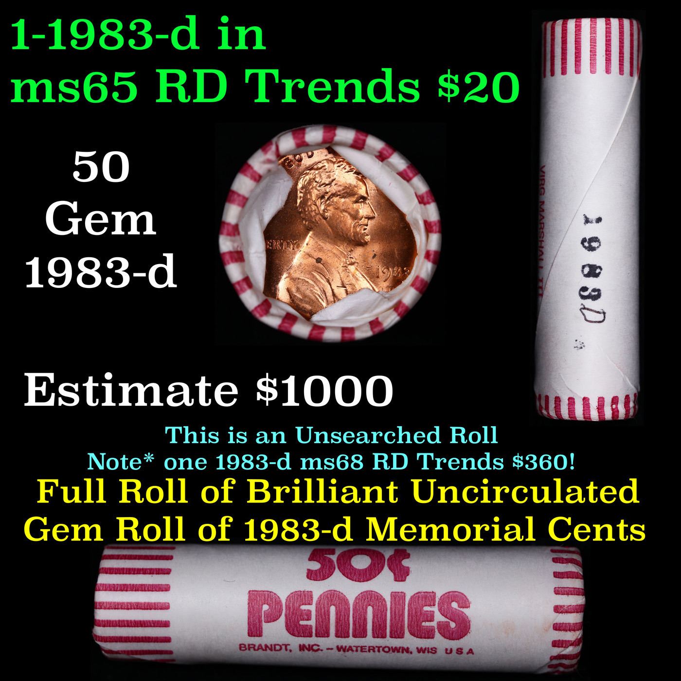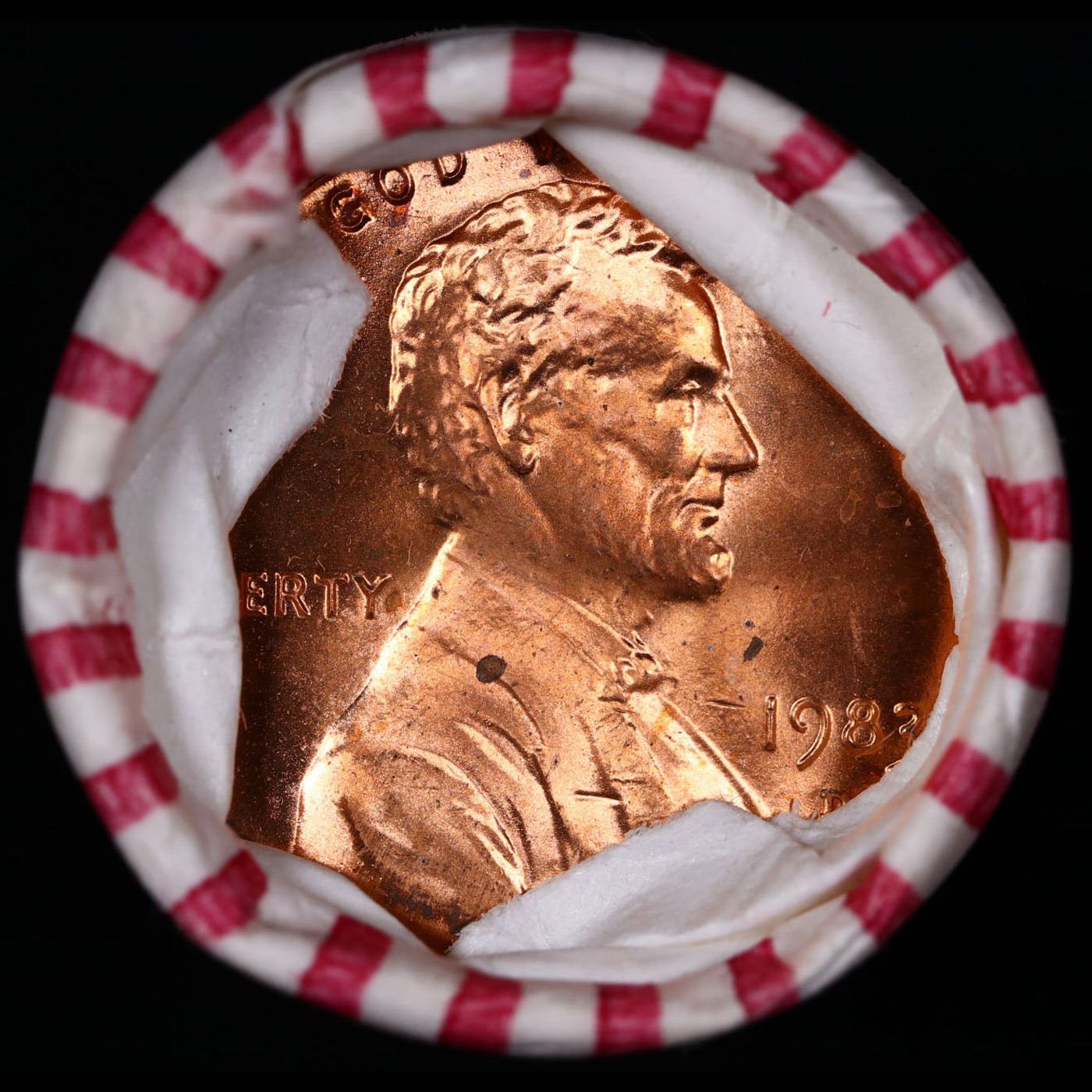 Shotgun Lincoln 1c roll, 1983-d 50 pcs N.F String & Son Wrapper . A terrific Shotgun roll of Lincoln cents. All coins cherry red. Trends ms65 rd $10