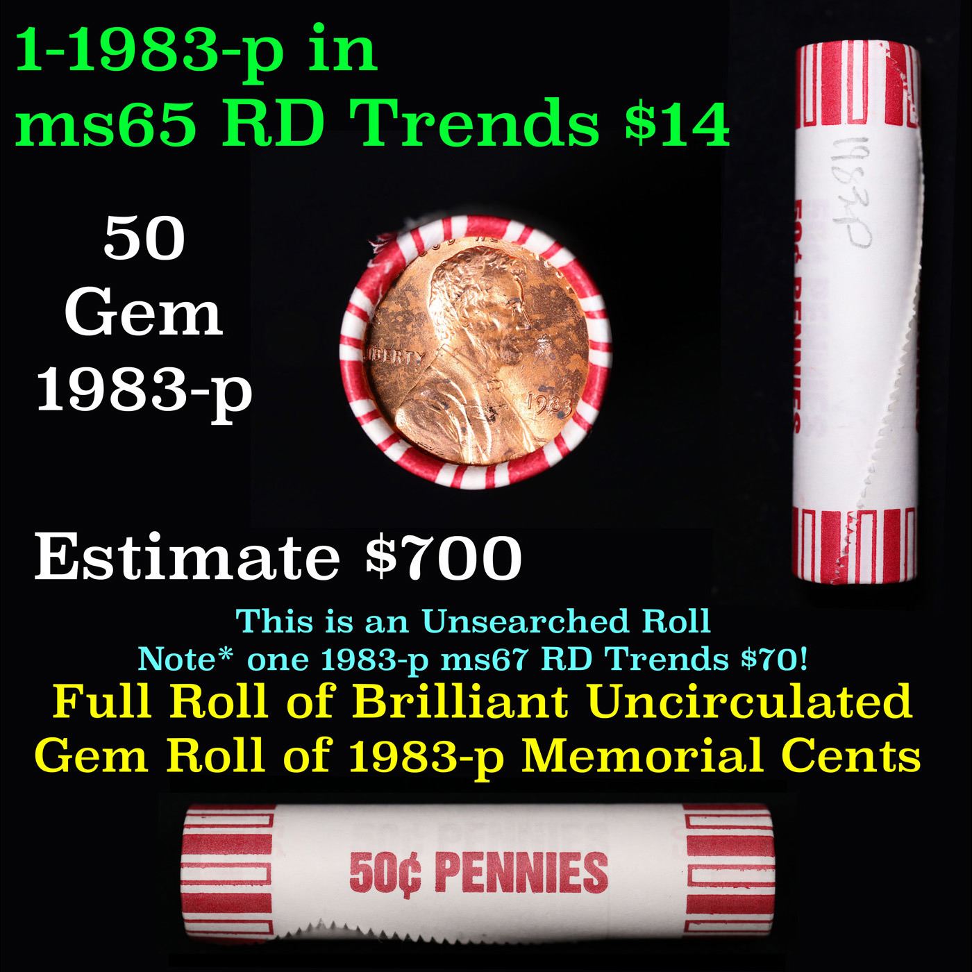 Shotgun Lincoln 1c roll, 1983-p 50 pcs Brandt 50c Wrapper.. A terrific Shotgun roll of Lincoln cents. Most if not all coin should be cherry red.