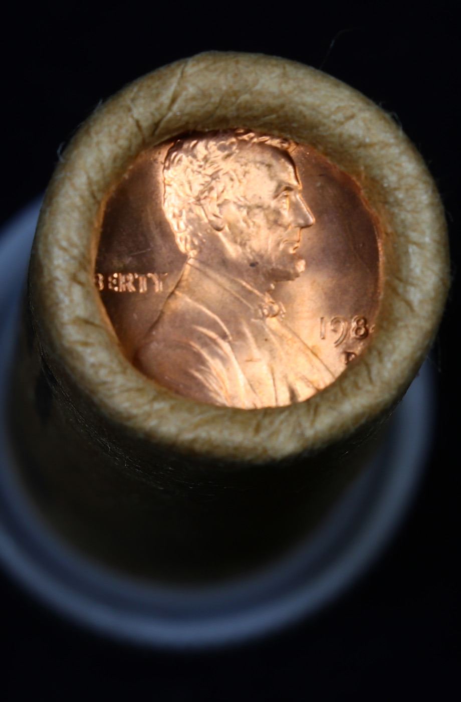 Shotgun Lincoln 1c roll, 1984-d 50 pcs Brandt Wrapper. A terrific orig shotgun roll of Lincoln cents. All coins cherry red.. Trends ms65 rd $10.00 Estimate $500