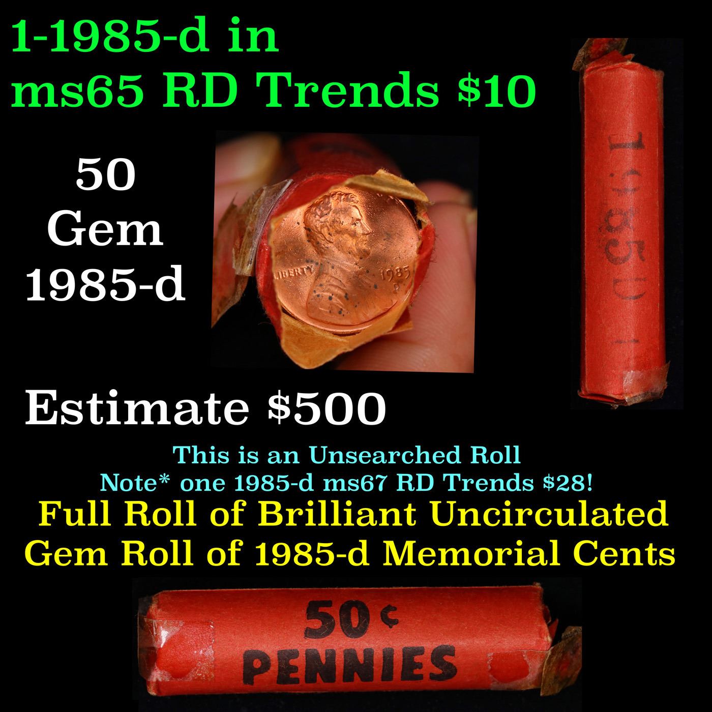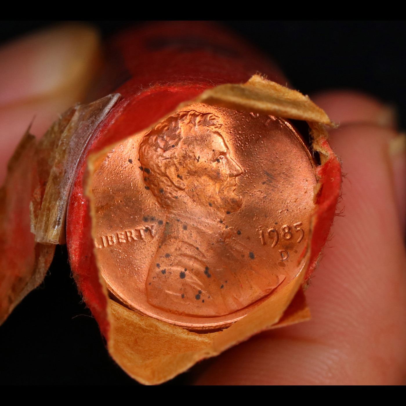 Shotgun Lincoln 1c roll, 1985-d 50 pcs Red Wrapper.. A terrific Shotgun roll of Lincoln cents. Most if not all coin should be cherry red.