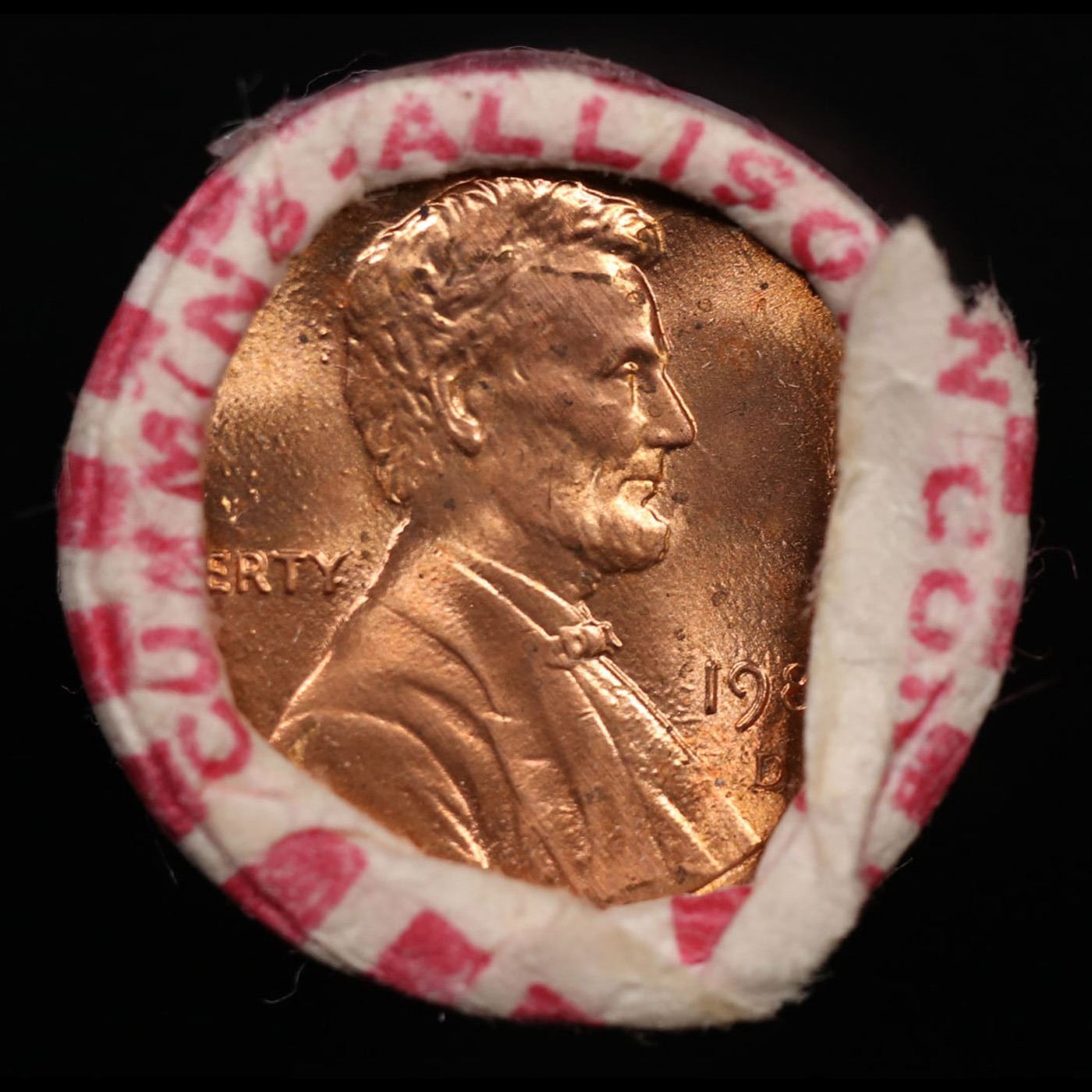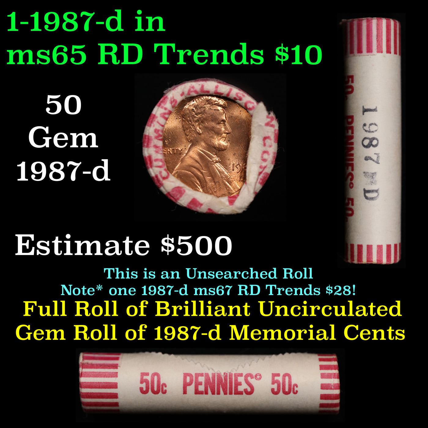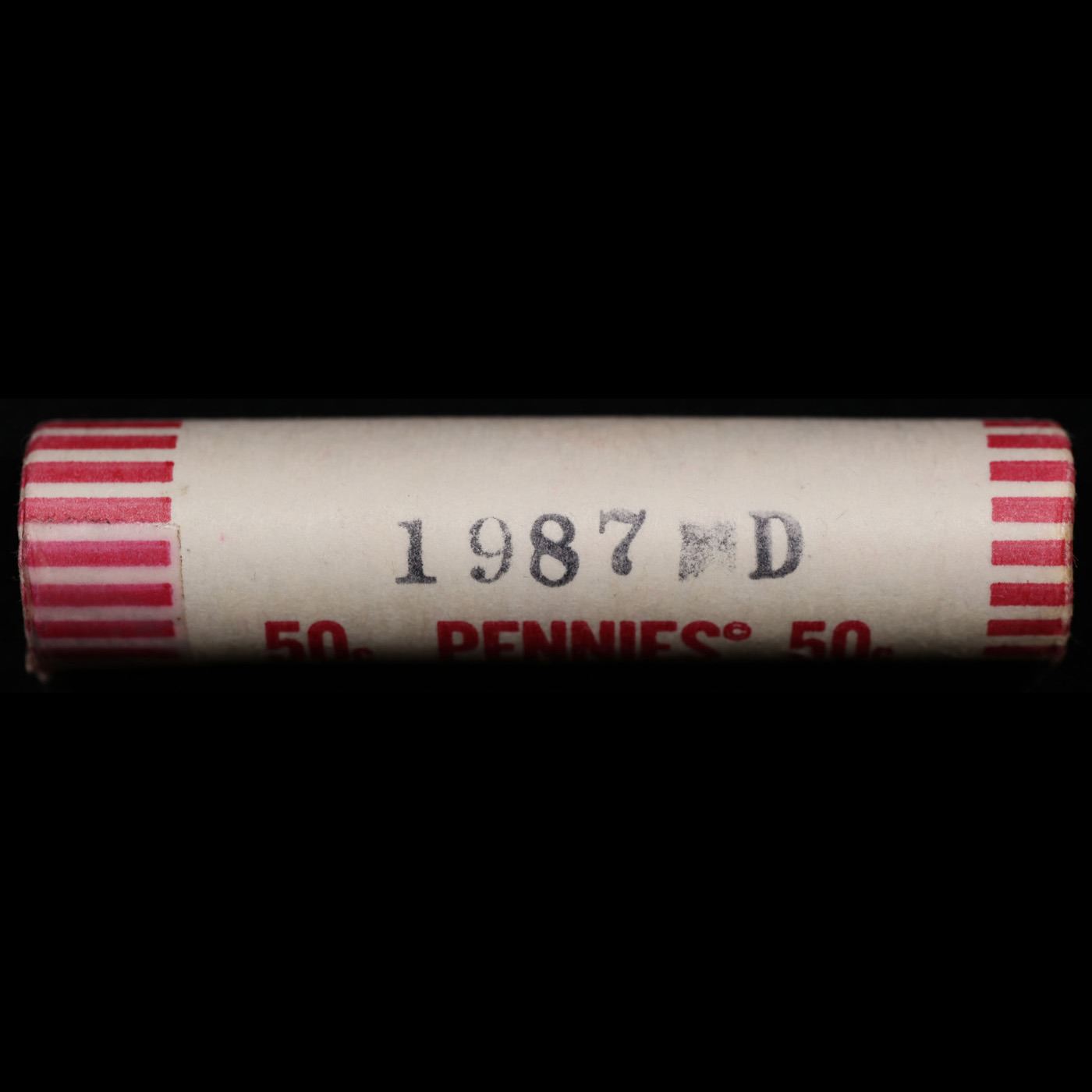 Shotgun Lincoln 1c roll, 1987-d 50 pcs Wrapper.. A terrific Shotgun roll of Lincoln cents. All coins appear to be cherry red. Trends ms65 rd $10