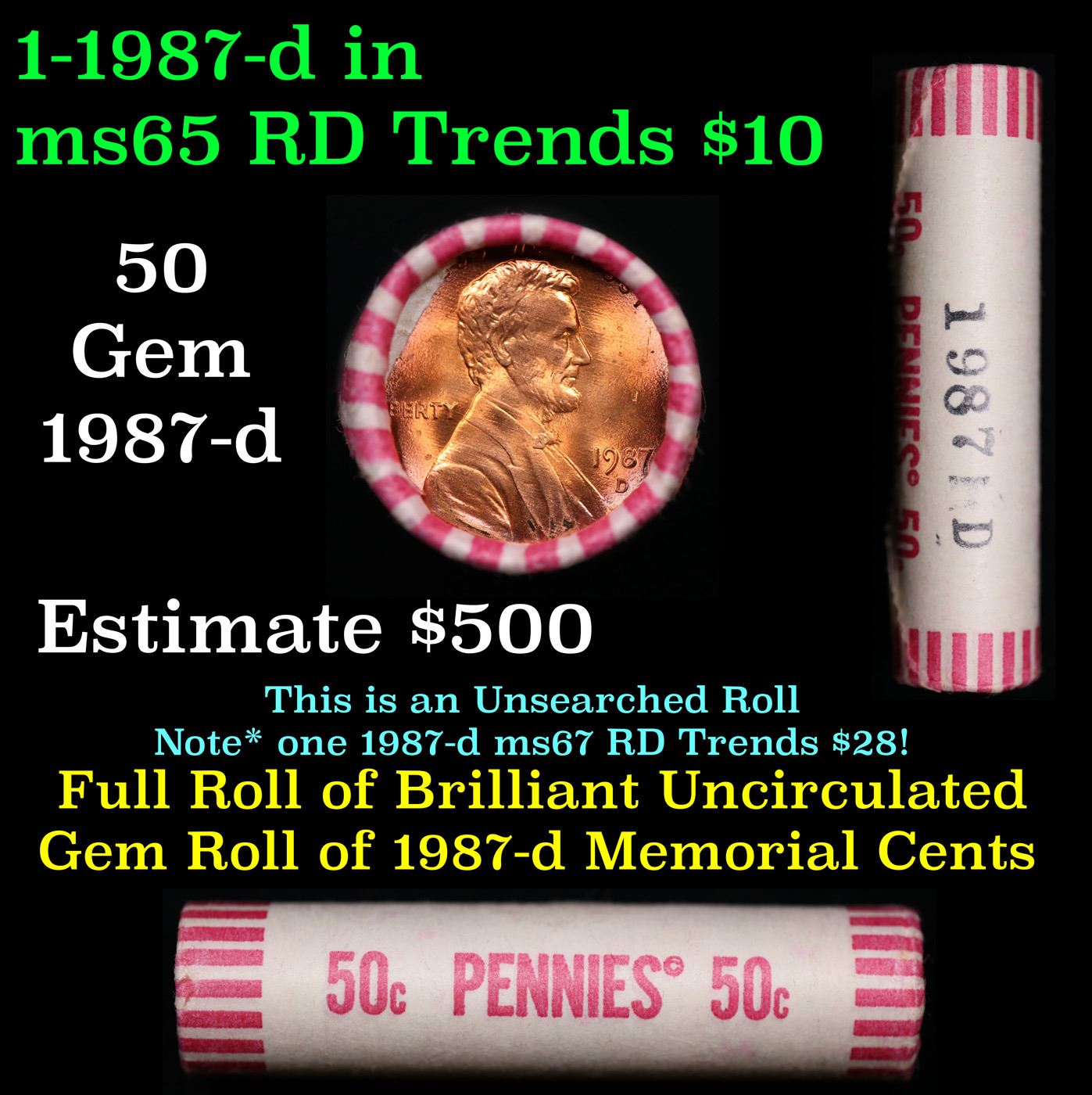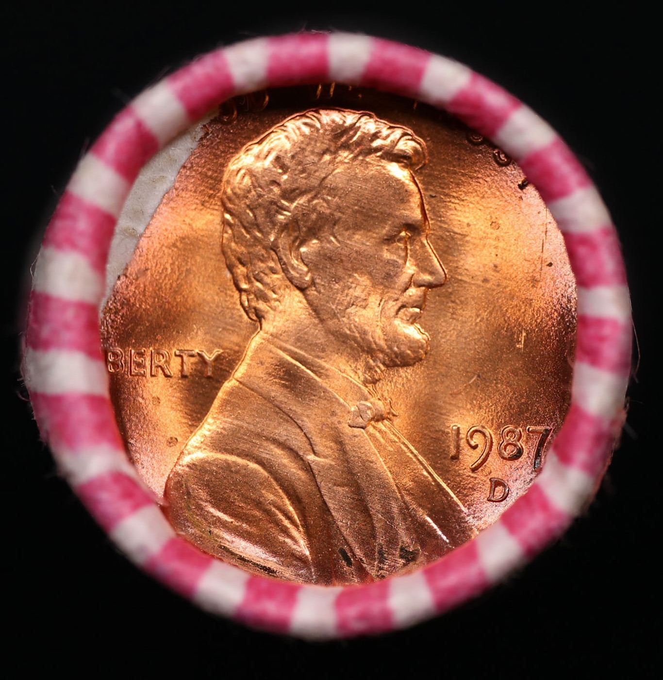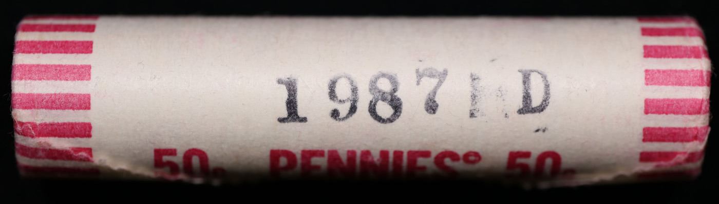 Shotgun Lincoln 1c roll, 1987-d 50 pcs Wrapper.. A terrific Shotgun roll of Lincoln cents. All coins appear to be cherry red. Trends ms65 rd $10