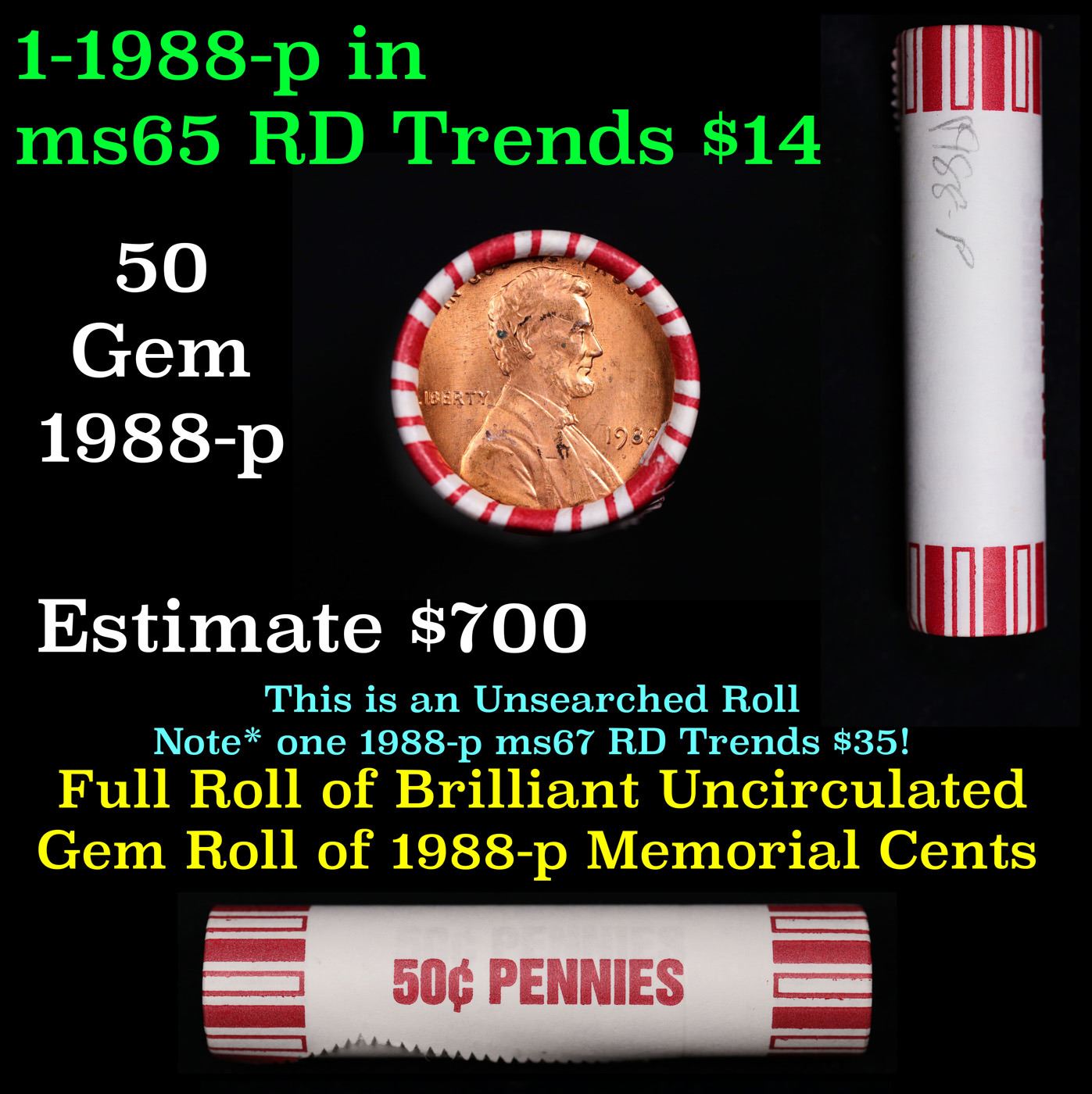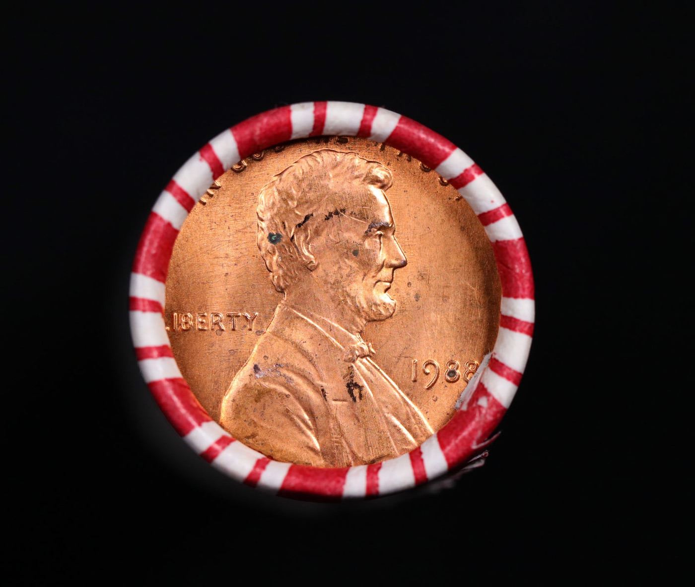 Shotgun Lincoln 1c roll, 1988-p 50 pcs Brandt 50c Wrapper.. A terrific Shotgun roll of Lincoln cents. Most if not all coin should be cherry red.