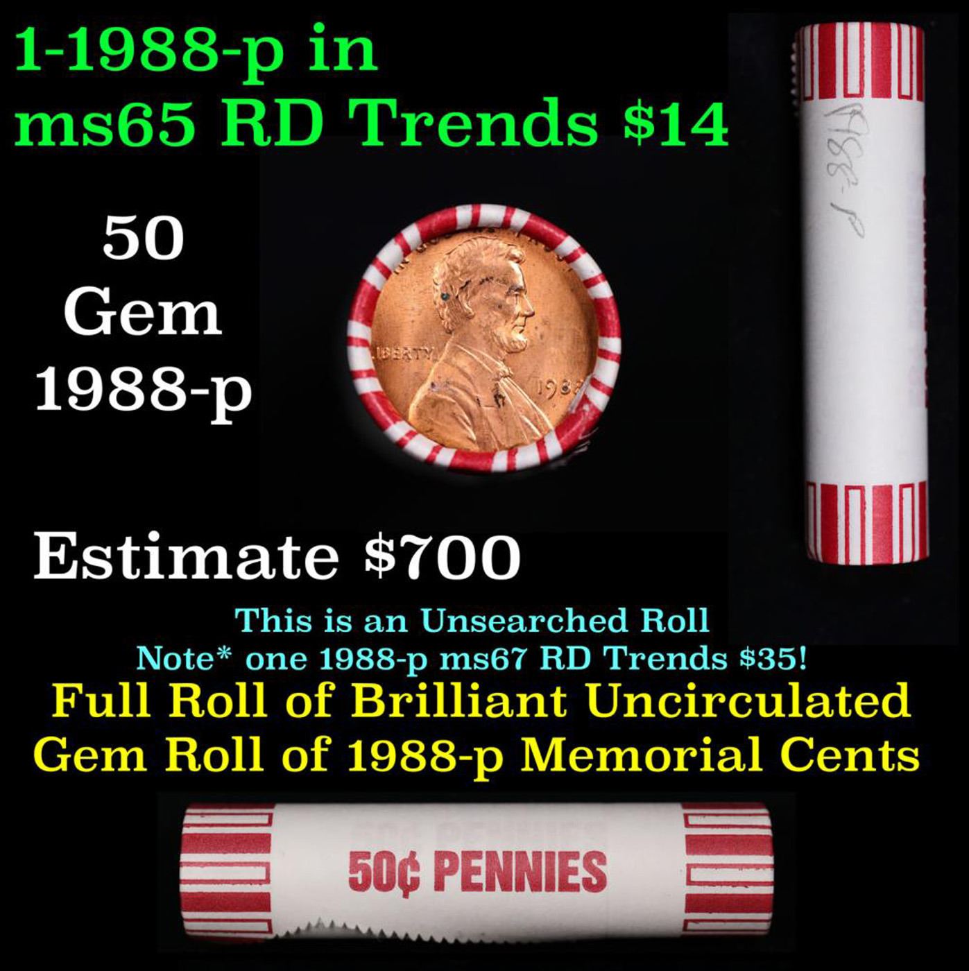 Shotgun Lincoln 1c roll, 1988-p 50 pcs Brandt 50c Wrapper.. A terrific Shotgun roll of Lincoln cents. Most if not all coin should be cherry red.