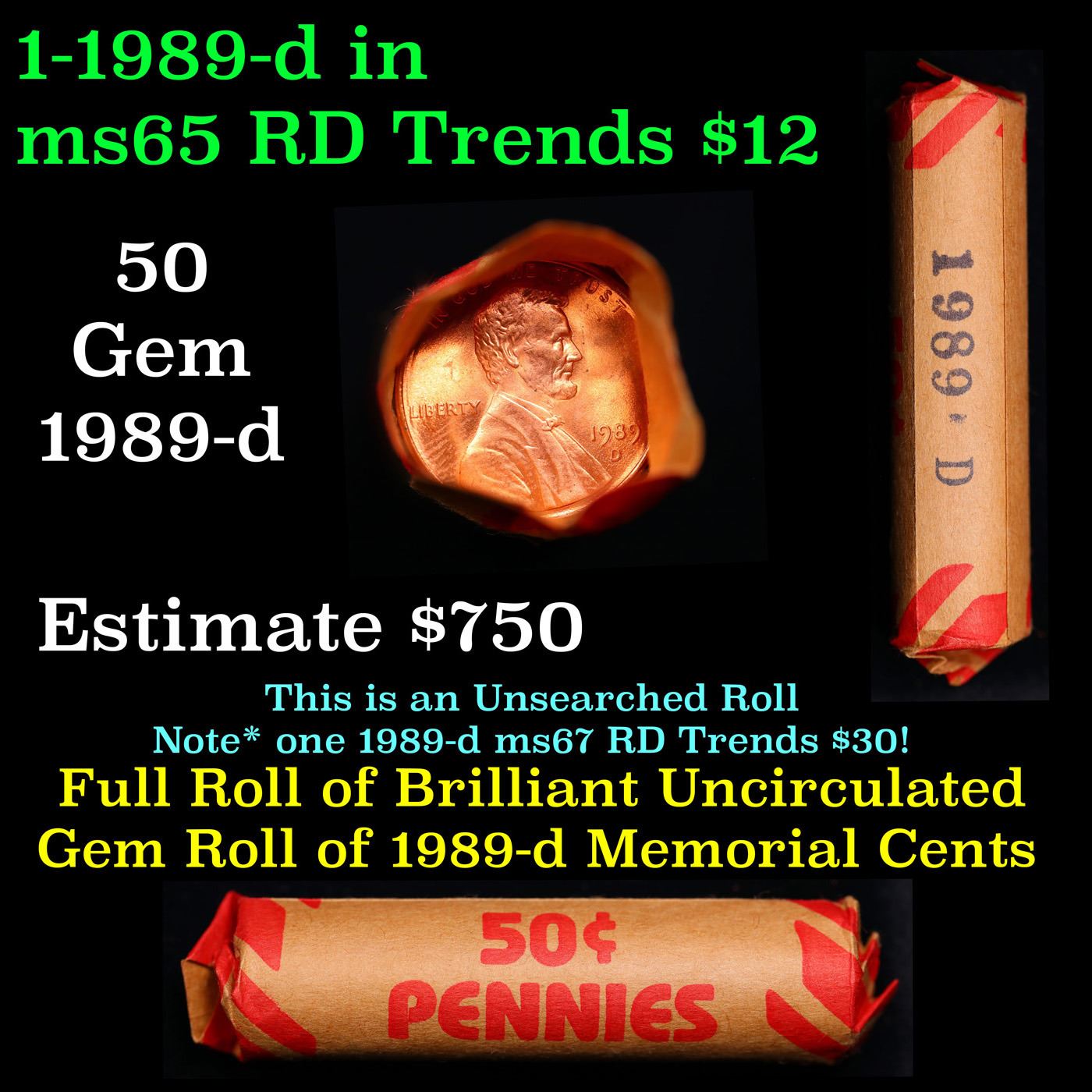 Shotgun Lincoln 1c roll, 1989-d 50 pcs Wrapper.. A terrific Shotgun roll of Lincoln cents. Most if not all coin should be cherry red. Trends ms65 rd $12
