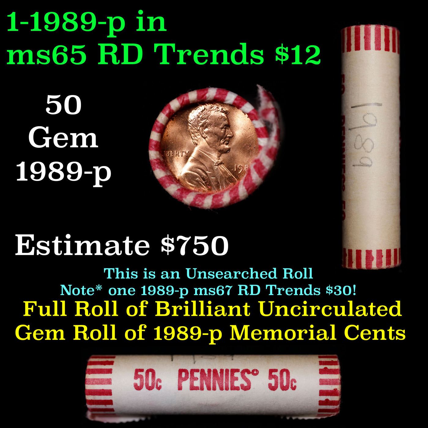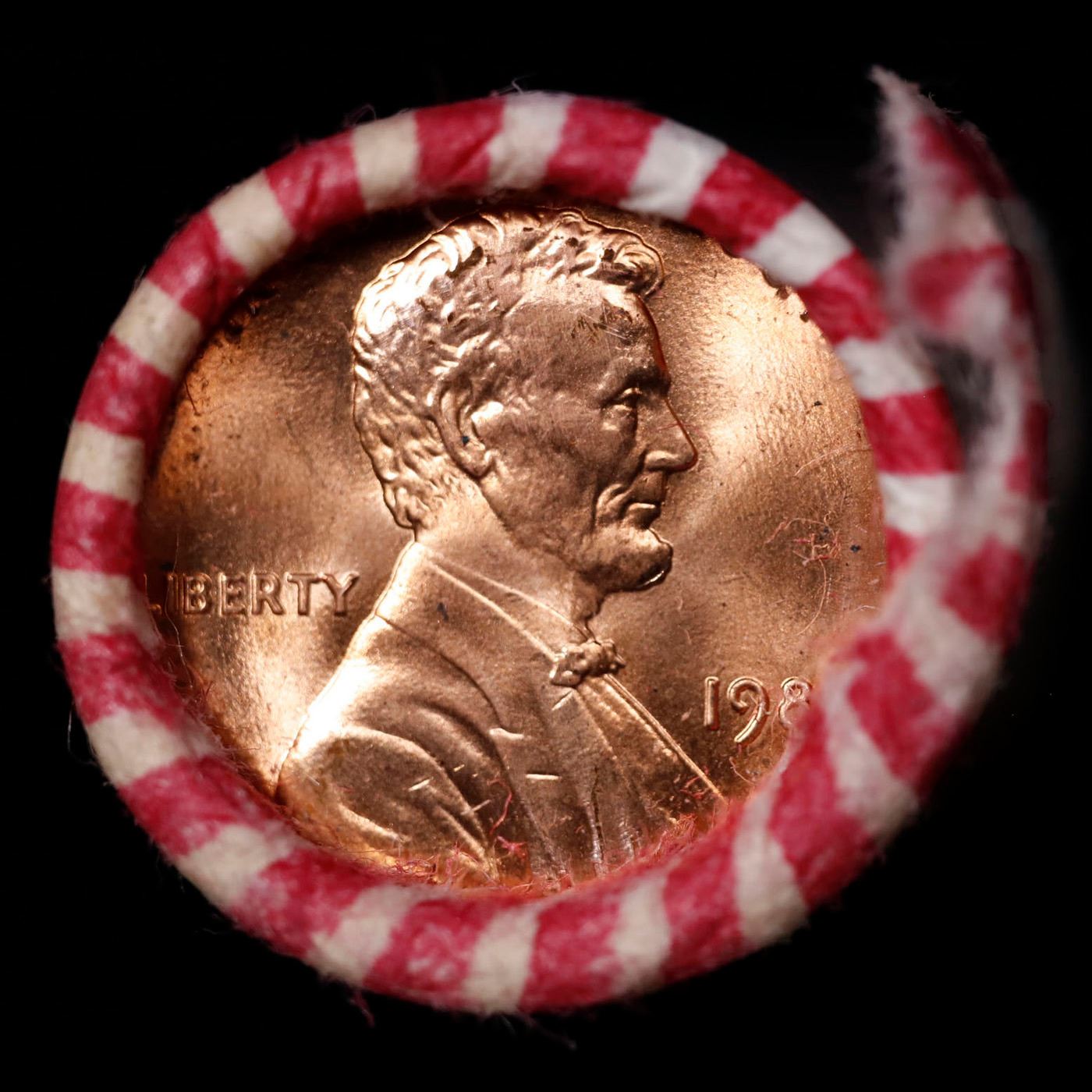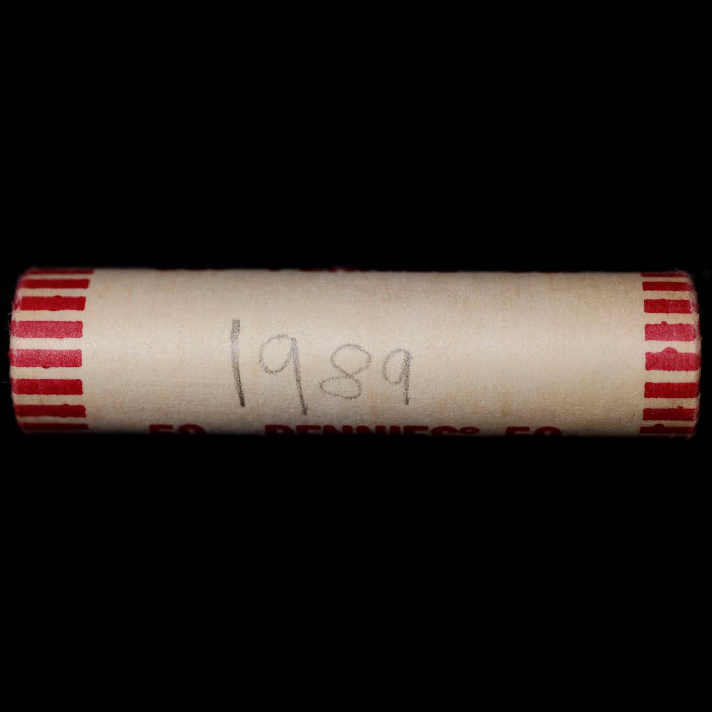 Shotgun Lincoln 1c roll, 1989-p 50 pcs Wrapper.. A terrific Shotgun roll of Lincoln cents. Most if not all coin should be cherry red. Trends ms65 rd $10