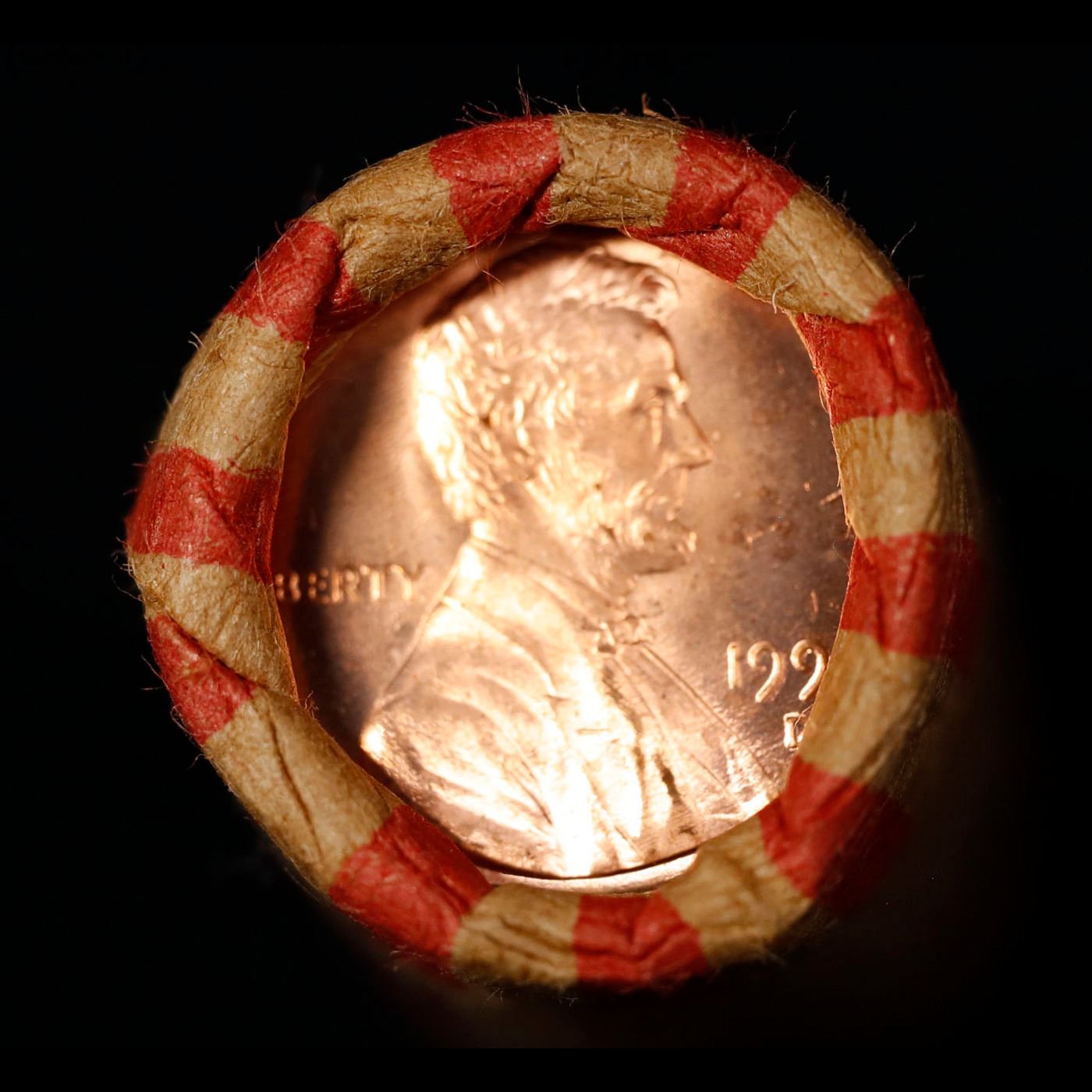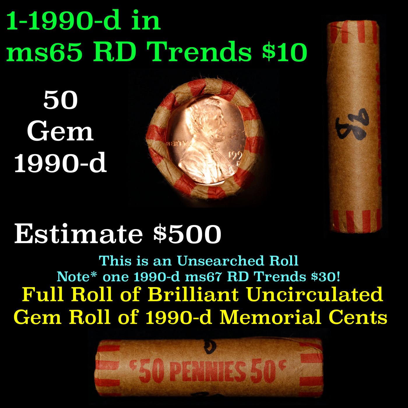 Shotgun Lincoln 1c roll, 1990-D 50 pcs brandt wrapper. A terrific Shotgun roll of Lincoln cents. Most if not all coin should be cherry red.