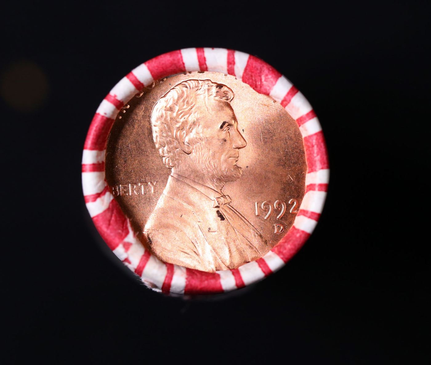 Shotgun Lincoln 1c roll, 1992-d 50 pcs Brandt 50c Wrapper.. A terrific Shotgun roll of Lincoln cents. Most if not all coin should be cherry red.
