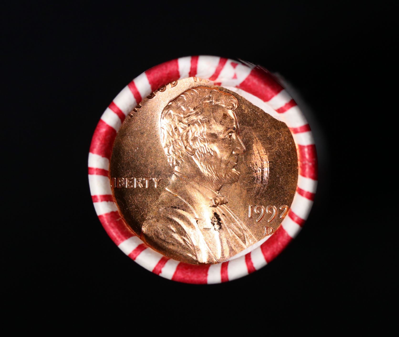 Shotgun Lincoln 1c roll, 1992-d 50 pcs Brandt 50c Wrapper.. A terrific Shotgun roll of Lincoln cents. Most if not all coin should be cherry red.