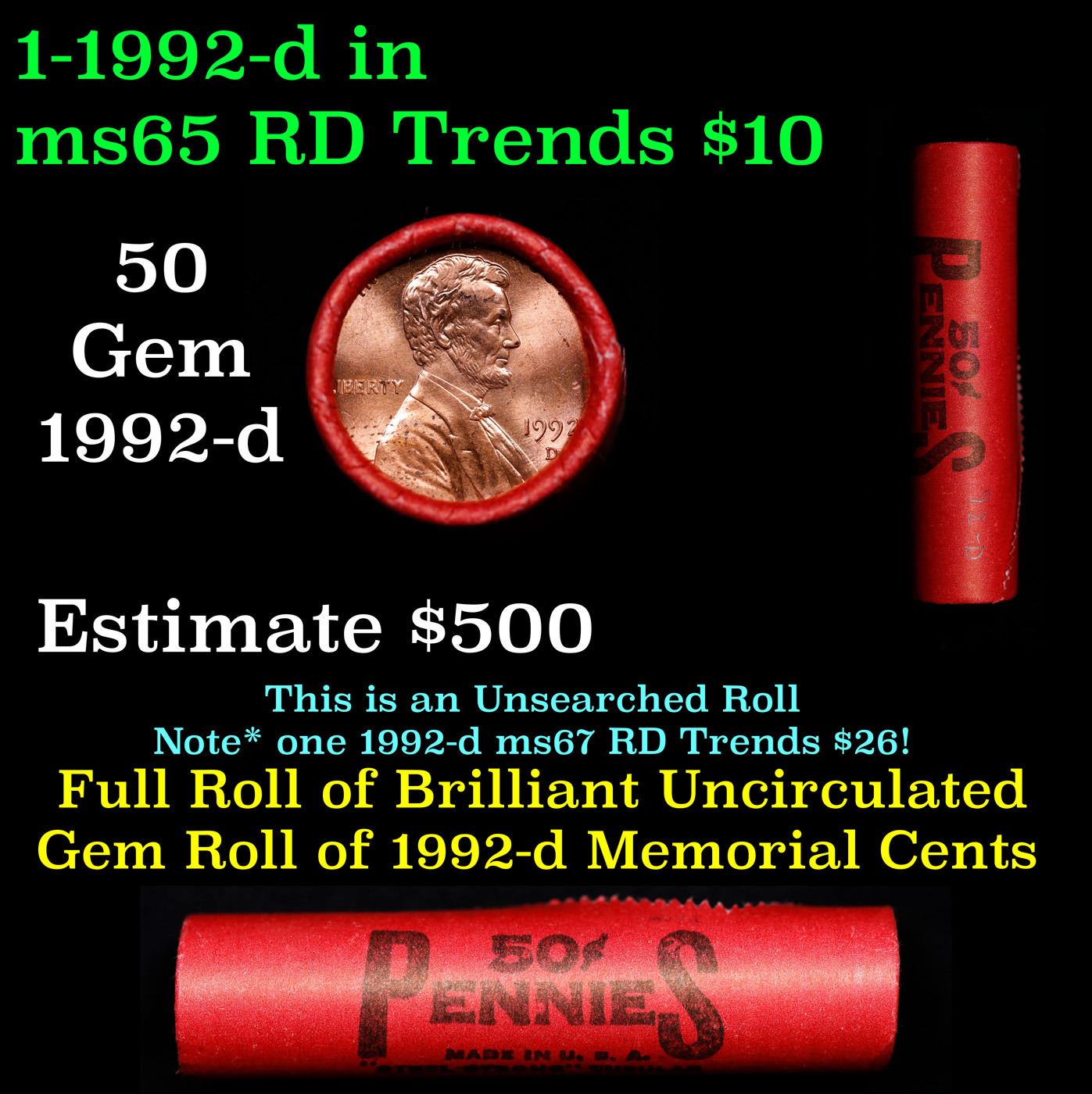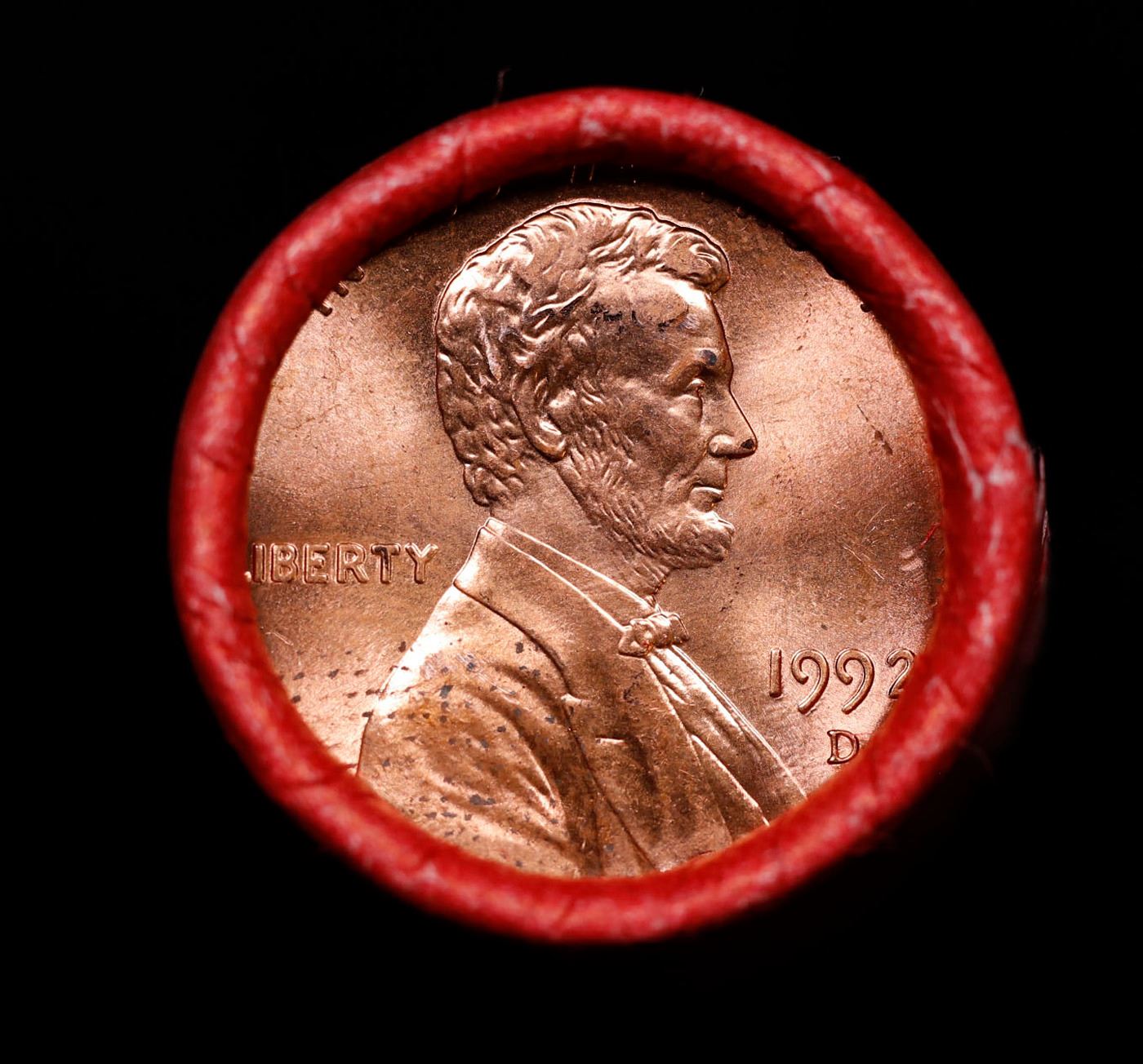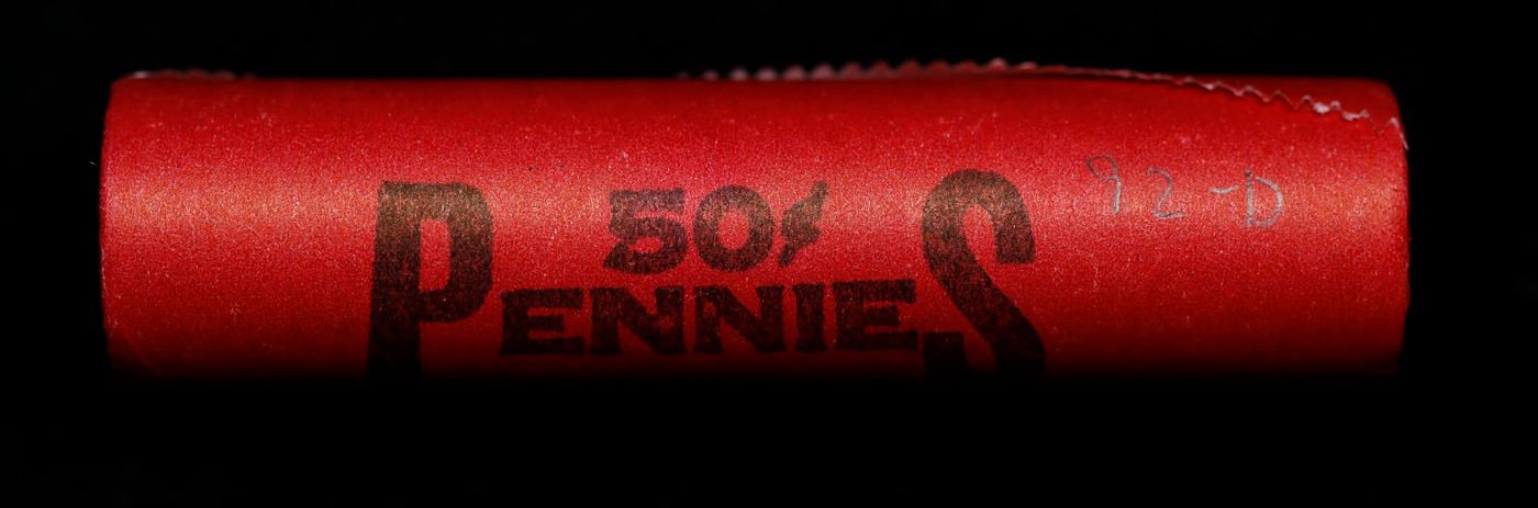 Shotgun Lincoln 1c roll, 1992-d 50 pcs Steel-Strong Wrapper.. A terrific Shotgun roll of Lincoln cents. Most if not all coin should be cherry red.