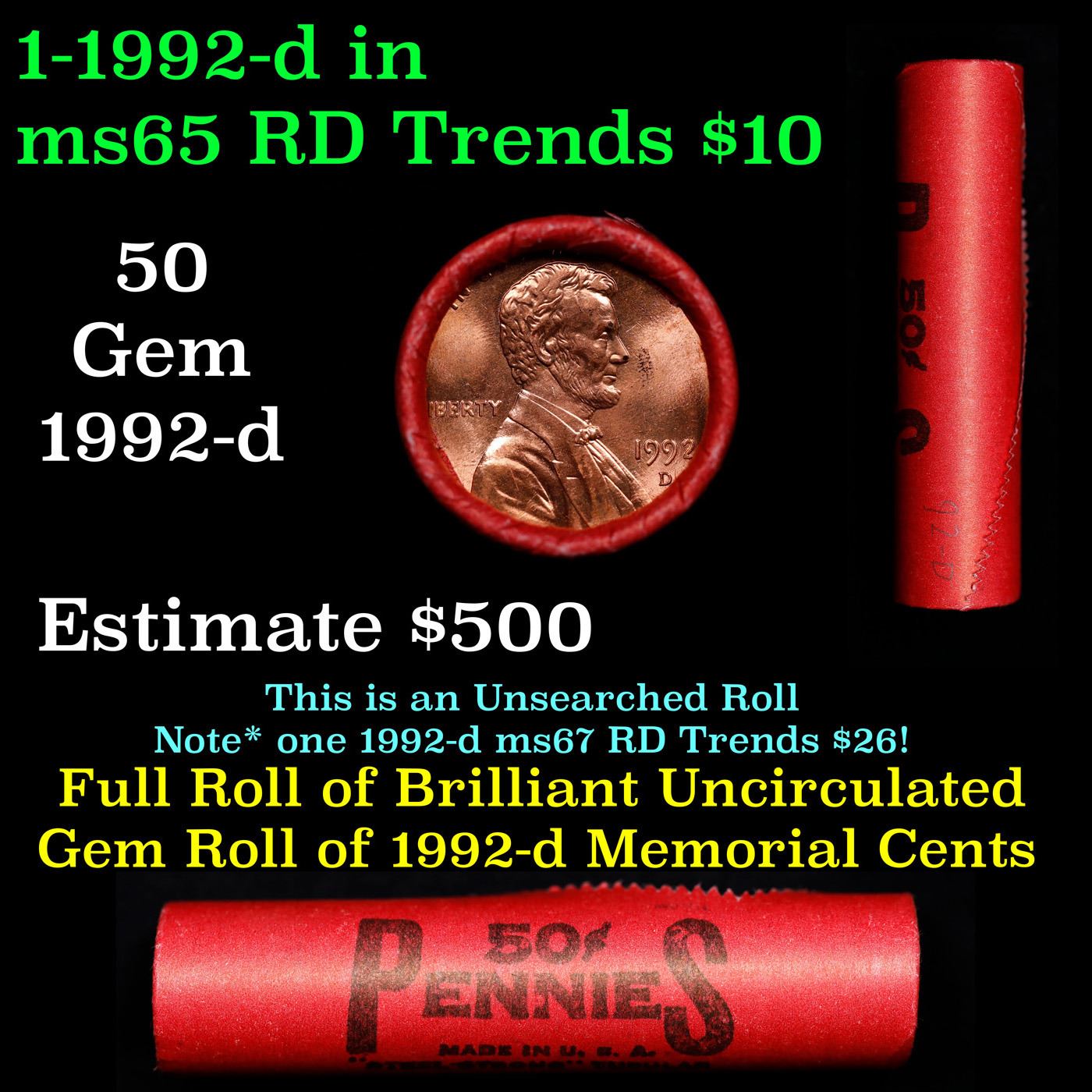 Shotgun Lincoln 1c roll, 1992-d 50 pcs Steel-Strong Wrapper.. A terrific Shotgun roll of Lincoln cents. Most if not all coin should be cherry red.