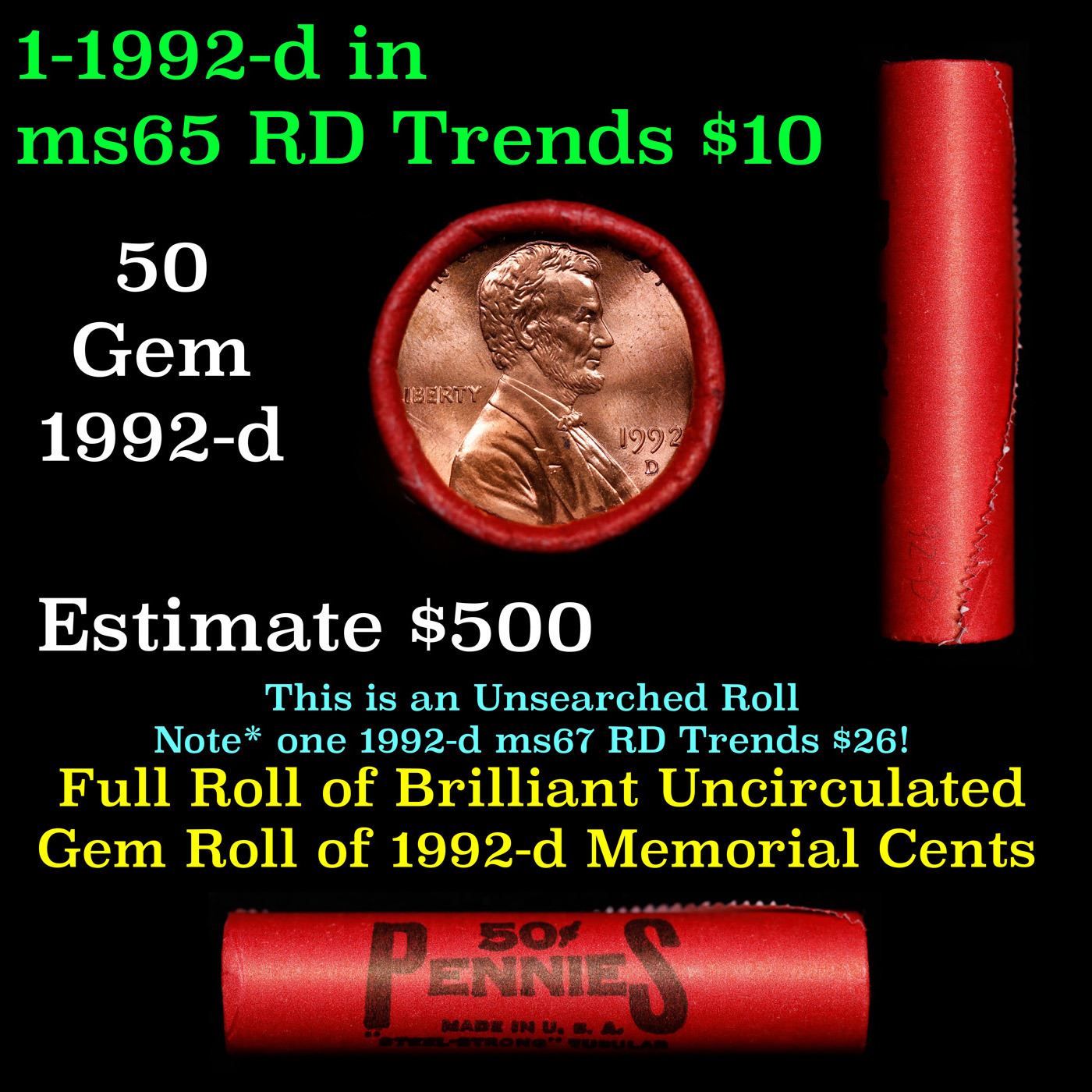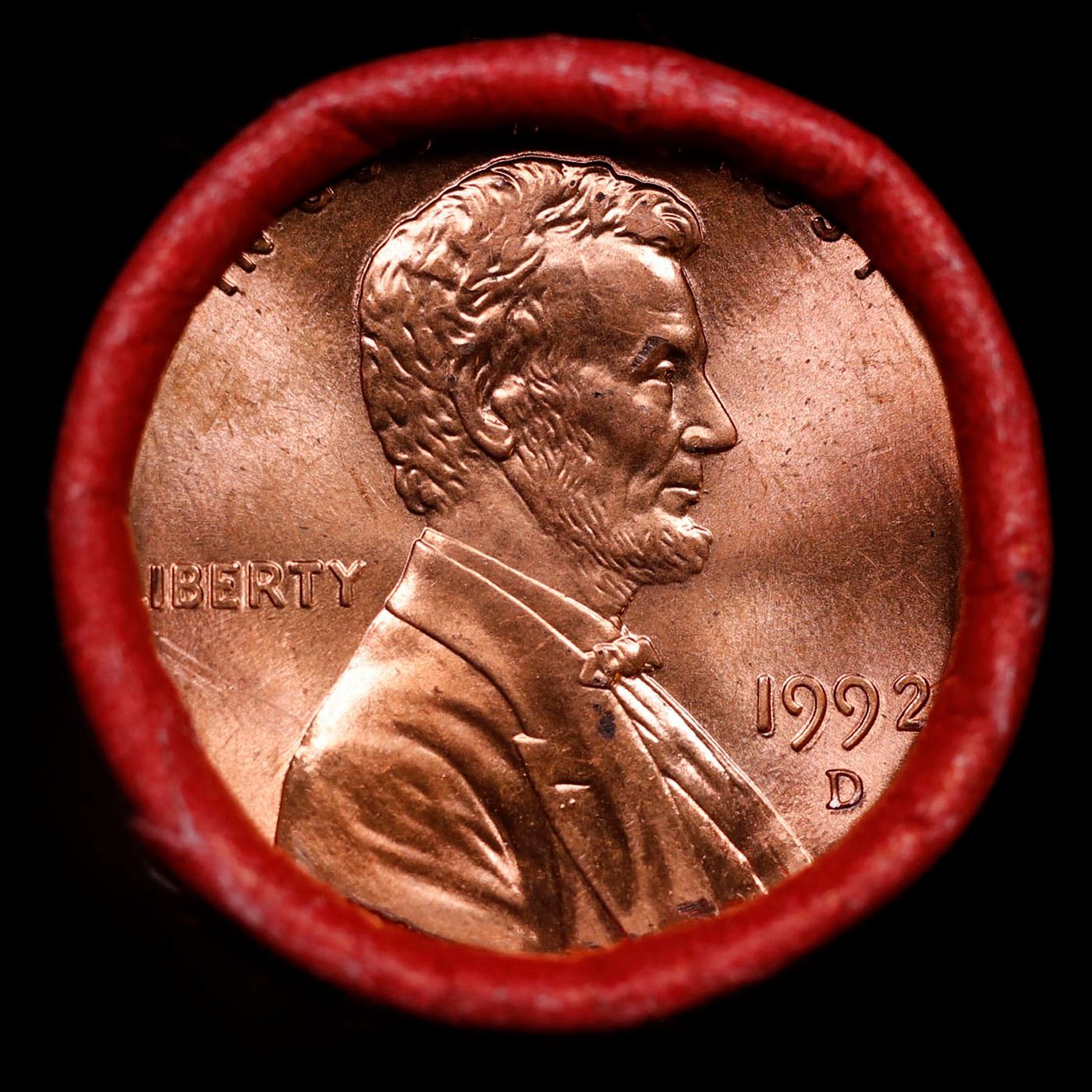Shotgun Lincoln 1c roll, 1992-d 50 pcs Steel-Strong Wrapper.. A terrific Shotgun roll of Lincoln cents. Most if not all coin should be cherry red.