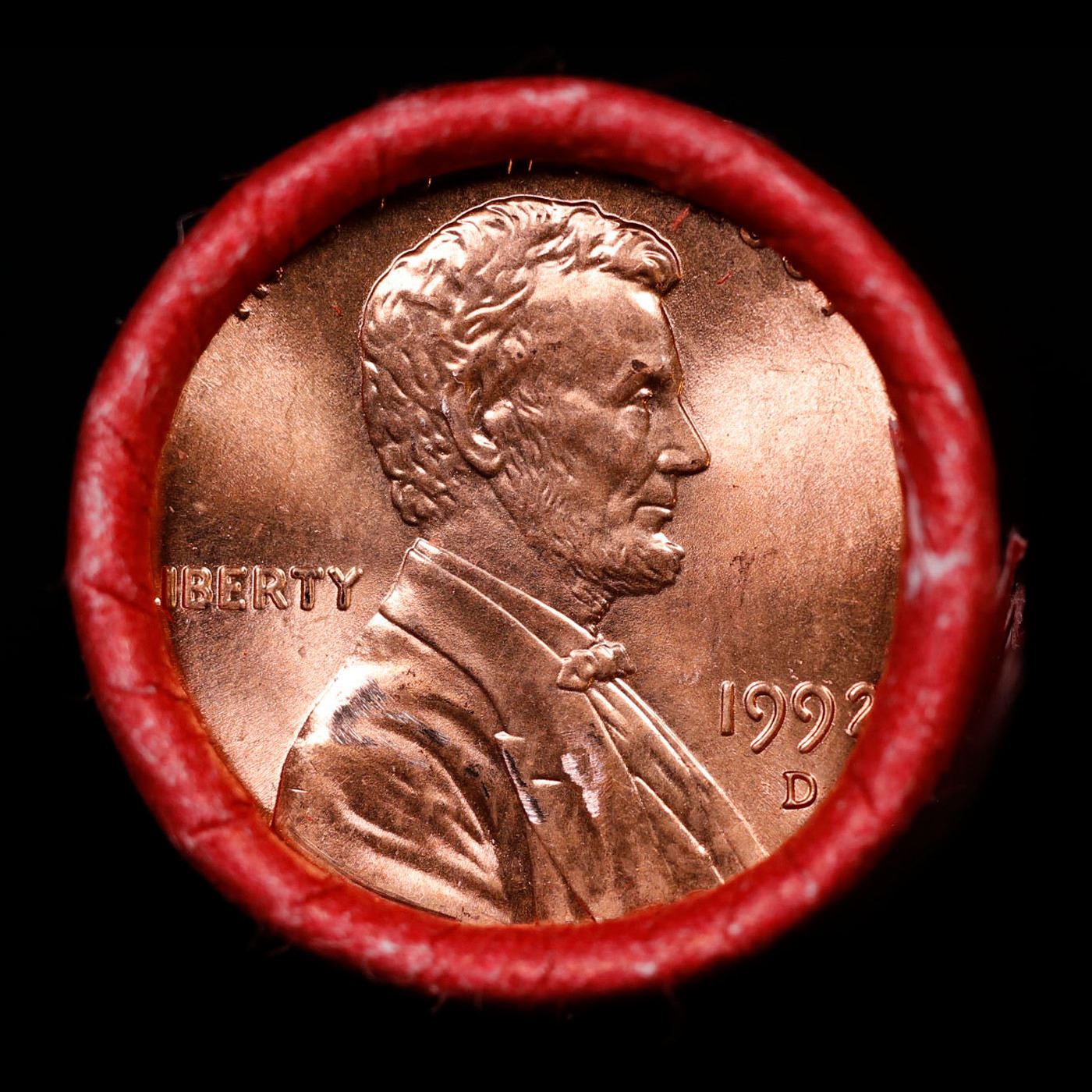 Shotgun Lincoln 1c roll, 1992-d 50 pcs Steel-Strong Wrapper.. A terrific Shotgun roll of Lincoln cents. Most if not all coin should be cherry red.