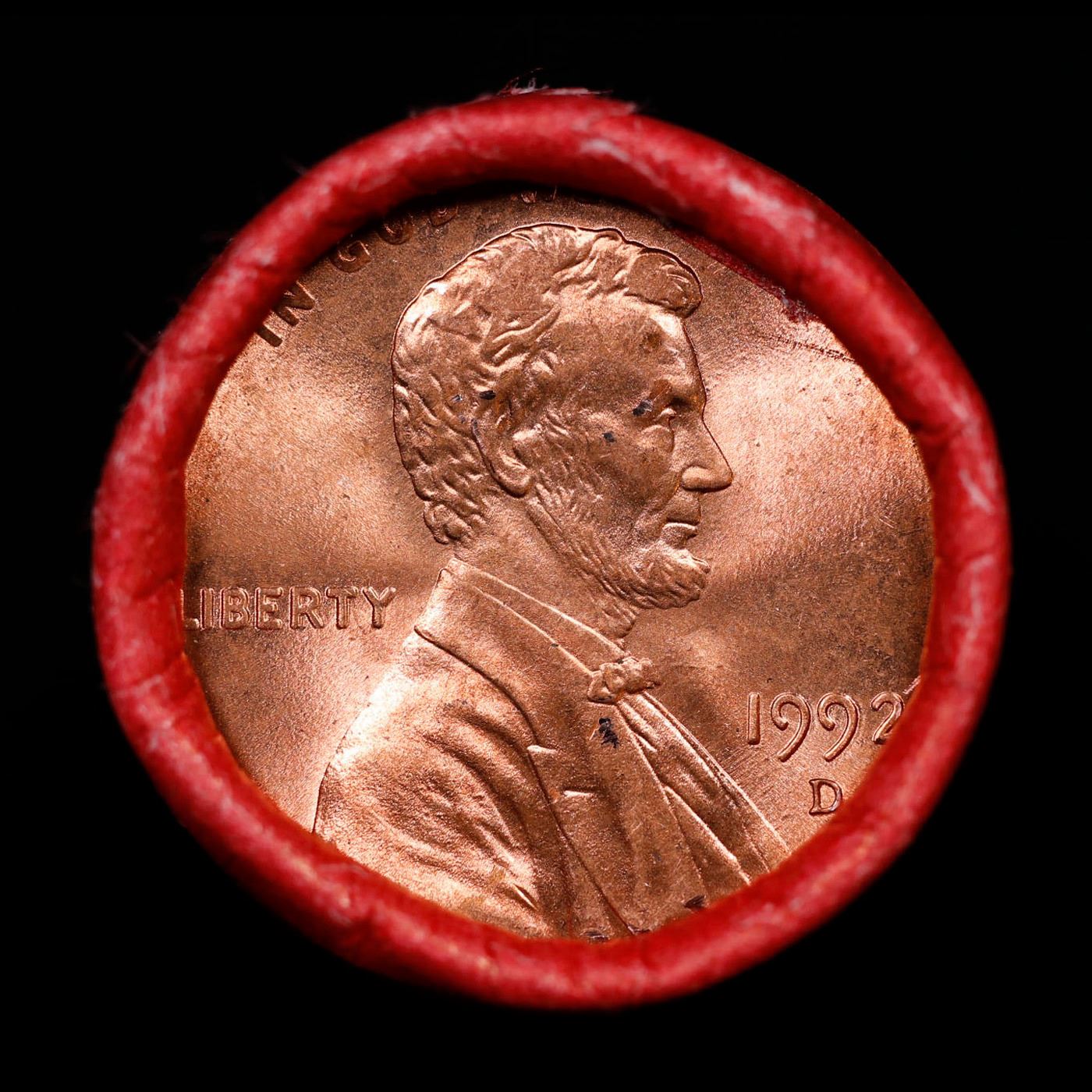 Shotgun Lincoln 1c roll, 1992-d 50 pcs Steel-Strong Wrapper.. A terrific Shotgun roll of Lincoln cents. Most if not all coin should be cherry red.